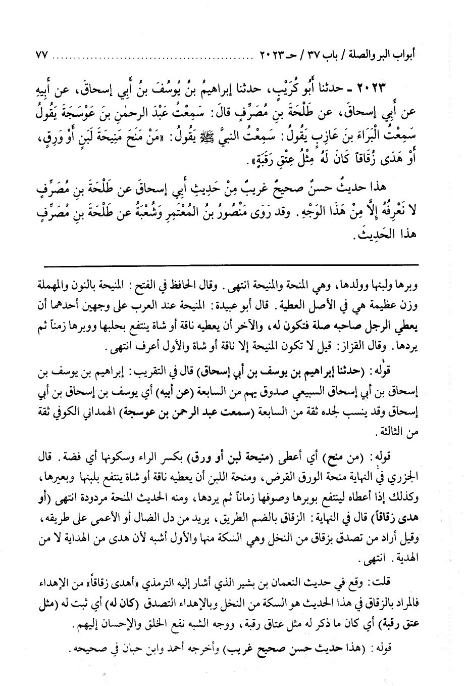 قَوْلُهُ [1957] (حَدَّثَنَا إِبْرَاهِيمُ بْنُ يُوسُفَ بْنِ أَبِي إِسْحَاقَ) قَالَ فِي التَّقْرِيبِ إِبْرَاهِيمُ بْنُ يُوسُفَ بْنِ إِسْحَاقَ بْنِ أَبِي إِسْحَاقَ السَّبِيعِيُّ صَدُوقٌ يَهِمُ مِنَ السَّابِعَةِ (عَنْ أَبِيهِ) أَيْ يُوسُفَ بْنِ إِسْحَاقَ بْنِ أَبِي إِسْحَاقَ وَقَدْ يُنْسَبُ لِجَدِّهِ ثِقَةٌ مِنَ السَّابِعَةِ (سَمِعْتُ عَبْدَ الرَّحْمَنِ بْنَ عَوْسَجَةَ) الْهَمْدَانِيَّ الْكُوفِيَّ ثِقَةٌ مِنَ الثَّالِثَةِ