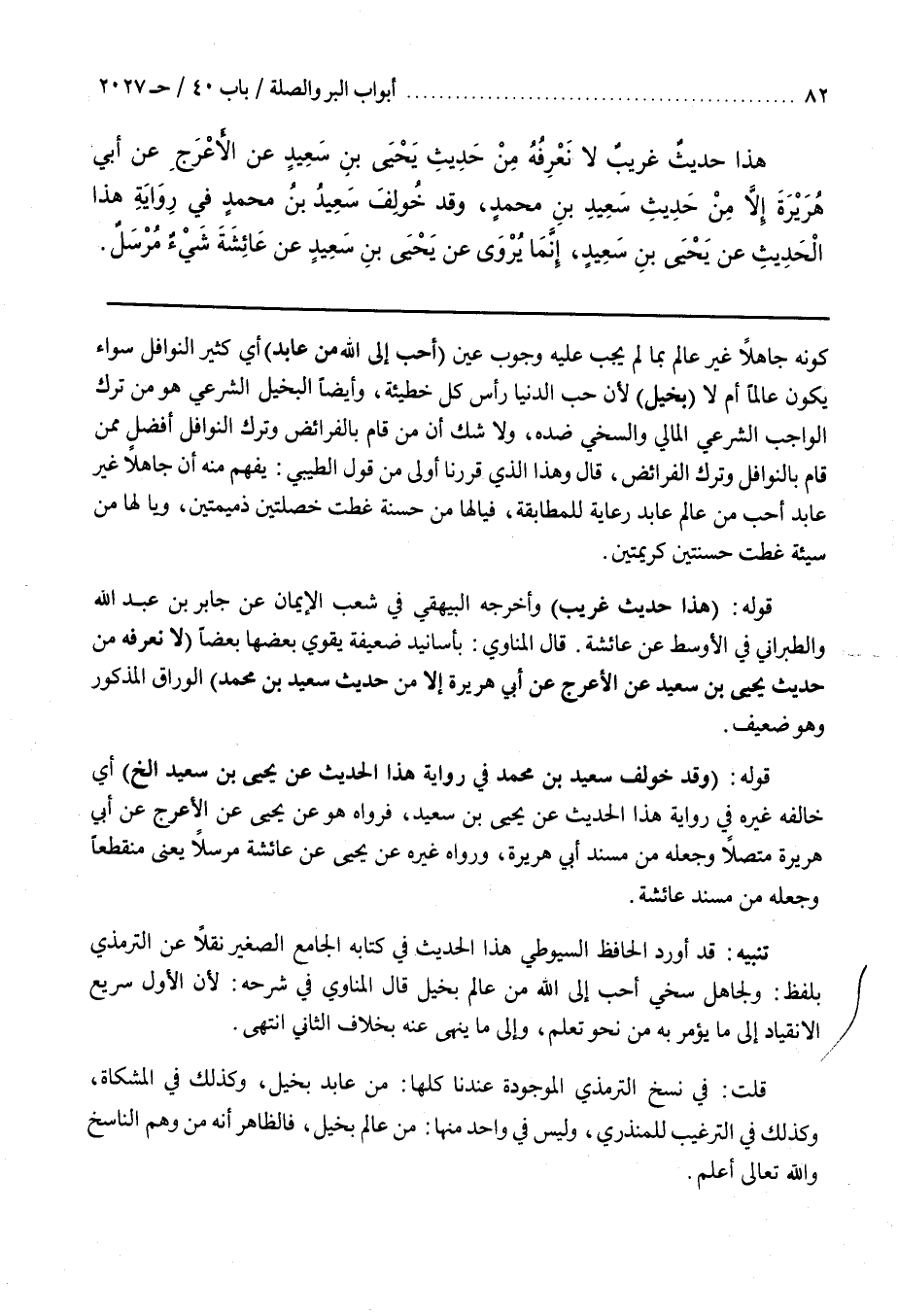 قُلْتُ فِي نُسَخِ التِّرْمِذِيِّ الْمَوْجُودَةِ عِنْدَنَا كُلِّهَا مِنْ عَابِدٍ بَخِيلٍ وَكَذَلِكَ فِي الْمِشْكَاةِ وَكَذَلِكَ فِي التَّرْغِيبِ لِلْمُنْذِرِيِّ وَلَيْسَ فِي وَاحِدٍ مِنْهَا مِنْ عَالِمٍ بَخِيلٍ فَالظَّاهِرُ أَنَّهُ مِنْ وَهْمِ النَّاسِخِ وَاللَّهُ تَعَالَى أَعْلَمُ