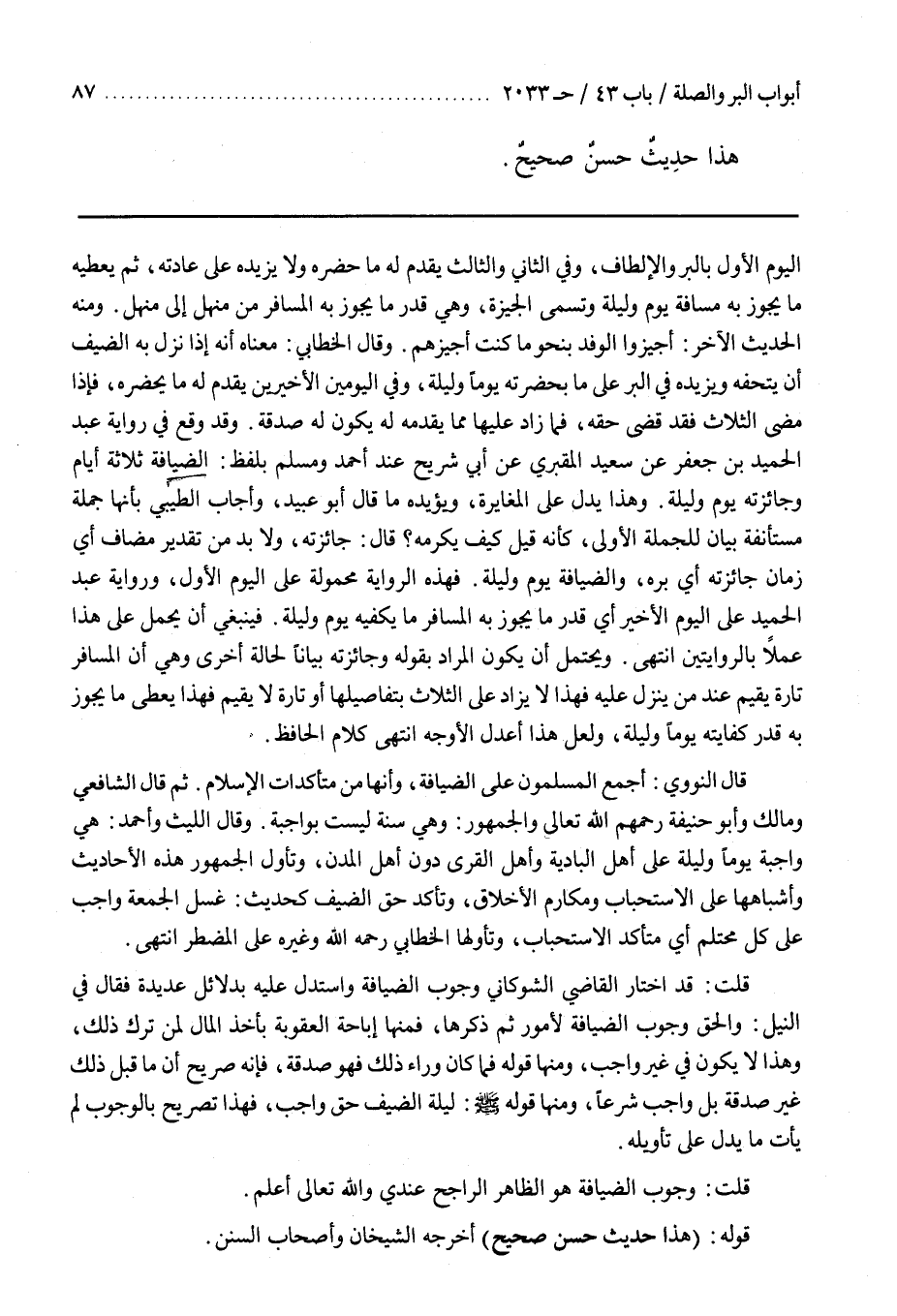 قُلْتُ قَدِ اخْتَارَ الْقَاضِي الشَّوْكَانِيُّ وُجُوبَ الضِّيَافَةِ وَاسْتَدَلَّ عَلَيْهِ بِدَلَائِلَ عَدِيدَةٍ فَقَالَ فِي النَّيْلِ وَالْحَقُّ وُجُوبُ الضِّيَافَةِ لِأُمُورٍ ثُمَّ ذَكَرَهَا فَمِنْهَا إِبَاحَةُ الْعُقُوبَةِ بِأَخْذِ الْمَالِ لِمَنْ تَرَكَ ذَلِكَ وَهَذَا لَا يَكُونُ فِي غَيْرِ وَاجِبٍ وَمِنْهَا قَوْلُهُ فَمَا كَانَ وَرَاءَ ذَلِكَ فَهُوَ صَدَقَةٌ فَإِنَّهُ صَرِيحٌ أَنَّ مَا قَبْلَ ذَلِكَ غَيْرُ صَدَقَةٍ بَلْ وَاجِبٌ شَرْعًا وَمِنْهَا قَوْلُهُ صَلَّى اللَّهُ عَلَيْهِ وَسَلَّمَ لَيْلَةُ الضَّيْفِ حَقٌّ وَاجِبٌ فَهَذَا تَصْرِيحٌ بِالْوُجُوبِ لَمْ يَأْتِ مَا يَدُلُّ عَلَى تَأْوِيلِهِ