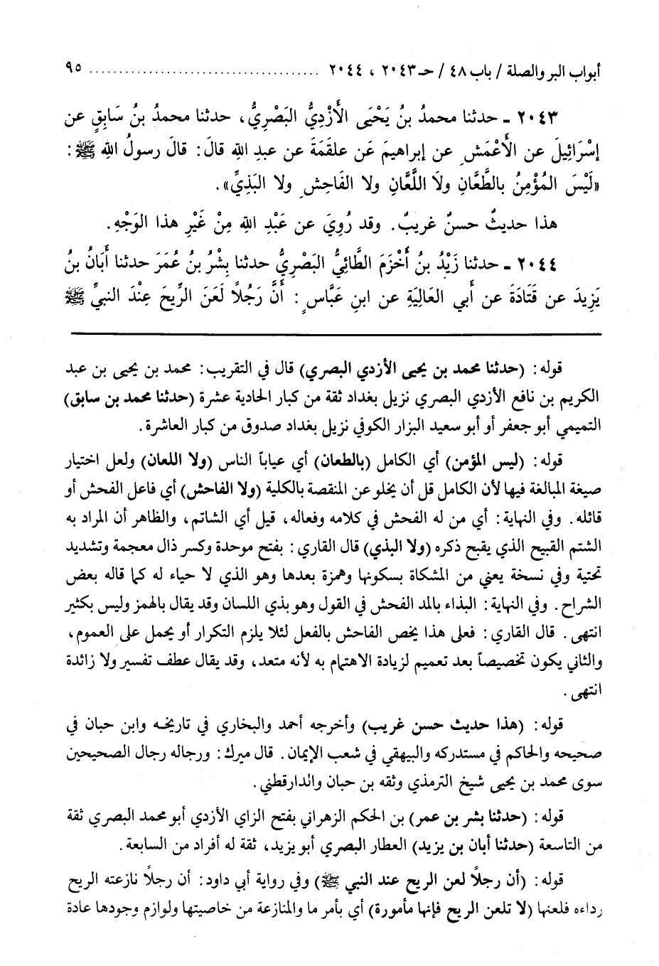 قَوْلُهُ (لَيْسَ الْمُؤْمِنُ) أَيِ الْكَامِلُ (بِالطَّعَّانِ) أَيْ عَيَّابًا النَّاسَ (وَلَا اللَّعَّانُ) وَلَعَلَّ اخْتِيَارَ صِيغَةِ الْمُبَالَغَةِ فِيهَا لِأَنَّ الْكَامِلَ قَلَّ أَنْ يَخْلُوَ عَنِ الْمَنْقَصَةِ بِالْكُلِّيَّةِ (وَلَا الْفَاحِشِ) أَيْ فَاعِلِ الْفُحْشِ أَوْ قَائِلِهِ