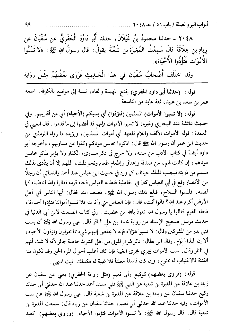 قَوْلُهُ (فَرَوَى بَعْضُهُمْ) كَوَكِيعٍ وَأَبِي نُعَيْمٍ (مِثْلَ رِوَايَةِ الْحَفَرِيِّ) يَعْنِي عَنْ سُفْيَانَ عَنْ زِيَادِ بْنِ عِلَاقَةَ عَنِ الْمُغِيرَةِ بْنِ شُعْبَةَ عَنِ النَّبِيِّ صَلَّى اللَّهُ عَلَيْهِ وَسَلَّمَ فَفِي مُسْنَدِ أَحْمَدَ حَدَّثَنَا عَبْدُ اللَّهِ حَدَّثَنِي أَبِي حَدَّثَنَا وَكِيعٌ حَدَّثَنَا سُفْيَانُ عَنْ زِيَادِ بْنِ عِلَاقَةَ عَنِ الْمُغِيرَةِ بْنِ شُعْبَةَ قَالَ نَهَى رَسُولُ اللَّهِ صَلَّى اللَّهُ عَلَيْهِ وَسَلَّمَ عَنْ سَبِّ الْأَمْوَاتِ وَفِيهِ حَدَّثَنَا عَبْدُ اللَّهِ حَدَّثَنِي أَبِي حَدَّثَنَا أَبُو نُعَيْمٍ حَدَّثَنَا سُفْيَانُ عَنْ زِيَادٍ قَالَ سَمِعْتُ الْمُغِيرَةَ بْنَ شُعْبَةَ قَالَ قَالَ رَسُولُ اللَّهِ صَلَّى اللَّهُ عَلَيْهِ وسلم لاتسبوا الْأَمْوَاتَ فَتُؤْذُوا الْأَحْيَاءَ