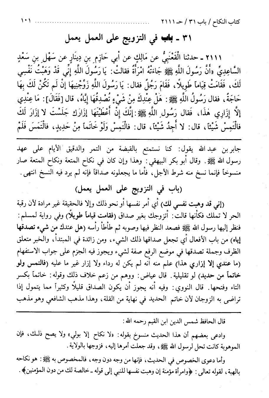 [2111] (إِنِّي قَدْ وَهَبْتُ نَفْسِي لَكَ) أَيْ أَمْرَ نَفْسِهَا أَوْ نَحْوَ ذَلِكَ وَإِلَّا فَالْحَقِيقَةُ غَيْرُ مُرَادِهِ لِأَنَّ رَقَبَةَ الْحُرِّ لَا تُمْلَكُ فَكَأَنَّهَا قَالَتْ أَتَزَوَّجُكَ بِغَيْرِ صَدَاقٍ (فَقَامَتْ قِيَامًا طَوِيلًا) وَفِي رِوَايَةٍ لِمُسْلِمٍ فَنَظَرَ إِلَيْهَا رَسُولُ اللَّهِ صَلَّى اللَّهُ عَلَيْهِ وَسَلَّمَ فَصَعَّدَ النَّظَرَ فِيهَا وَصَوَّبَهُ ثُمَّ طَأْطَأَ رَأْسَهُ (هَلْ عِنْدَكَ مِنْ شَيْءٍ تُصْدِقُهَا إِيَّاهُ) مِنْ بَابِ الْإِفْعَالِ أَيْ تَجْعَلُ صَدَاقَهَا ذَلِكَ الشَّيْءَ وَمِنْ زَائِدَةٌ فِي الْمُبْتَدَأِ وَالْخَبَرُ مُتَعَلِّقُ الظَّرْفِ وَجُمْلَةُ تُصْدِقُهَا فِي مَوْضِعِ الرَّفْعِ صِفَةٌ لِشَيْءٍ وَيَجُوزُ فِيهِ الْجَزْمُ عَلَى جَوَابِ الِاسْتِفْهَامِ (مَا عِنْدِي إِلَّا إِزَارِي هَذَا) عَلِمَ مِنْهُ أَنَّهُ لَمْ يَكُنْ لَهُ رِدَاءٌ وَلَا إِزَارٌ غَيْرَ مَا عَلَيْهِ (فَالْتَمِسْ وَلَوْ خَاتَمًا مِنْ حَدِيدٍ) لَوْ تَقْلِيلِيَّةٌ