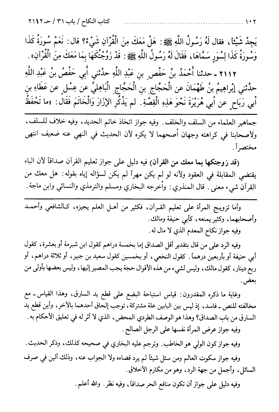 ــــــــــــQوَأَمَّا تَزْوِيج الْمَرْأَة عَلَى تَعْلِيم الْقُرْآن فَكَثِير مِنْ أَهْل الْعِلْم يُجِيزهُ كَالشَّافِعِيِّ وَأَحْمَد وَأَصْحَابهمَا وَكَثِير يَمْنَعهُ كَأَبِي حَنِيفَة وَمَالِك وَفِيهِ جَوَاز نِكَاح الْمُعْدِم الَّذِي لَا مَال لَهُ وَفِيهِ الرد عَلَى مَنْ قَالَ بِتَقْدِيرِ أَقَلّ الصَّدَاق إِمَّا بخمسة دراهم كقول بن شُبْرُمَةَ أَوْ بِعَشْرَةٍ كَقَوْلِ أَبِي حَنِيفَة أَوْ بِأَرْبَعِينَ دِرْهَمًا كَقَوْلِ النَّخَعِيِّ أَوْ بِخَمْسِينَ كَقَوْلِ سَعِيد بْن جُبَيْر أَوْ ثَلَاثَة دَرَاهِم أَوْ رُبْع دِينَار كَقَوْلِ مَالِك وَلَيْسَ لِشَيْءٍ مِنْ هَذِهِ الْأَقْوَال حُجَّة يَجِب الْمَصِير إِلَيْهَا وَلَيْسَ بَعْضهَا بِأَوْلَى مِنْ بَعْض وَغَايَة مَا ذَكَرَهُ الْمُقَدِّرُونَ قِيَاس اِسْتِبَاحَة الْبُضْع عَلَى قَطْع يَد السَّارِق وَهَذَا الْقِيَاس مَعَ مُخَالَفَته لِلنَّصِّ فَاسِد إِذْ لَيْسَ بَيْن الْبَابَيْنِ عِلَّة مُشْتَرَكَة تُوجِب إِلْحَاق أَحَدهمَا بِالْآخَرِ وَأَيْنَ قَطْع يَد السَّارِق مِنْ بَاب الصَّدَاق وَهَذَا هُوَ الْوَصْف الطَّرْدِيّ الْمَحْض الَّذِي لَا أَثَر لَهُ فِي تَعْلِيق الأحكام به وفيه جَوَاز عَرْض الْمَرْأَة نَفْسهَا عَلَى الرَّجُل الصَّالِح وَفِيهِ جَوَاز كَوْن الْوَلِيّ هُوَ الْخَاطِب وَتَرْجَمَ عَلَيْهِ الْبُخَارِيّ فِي صَحِيحه كَذَلِكَ وَذَكَرَ الْحَدِيث وَفِيهِ جَوَاز سُكُوت الْعَالِم وَمَنْ سُئِلَ شَيْئًا لَمْ يَرُدّ قَضَاءَهُ وَلَا الْجَوَاب عَنْهُ وَذَلِكَ أَلْيَن فِي صَرْف السَّائِل وَأَجْمَل مِنْ جِهَة الرَّدّ وَهُوَ مِنْ مَكَارِم الْأَخْلَاق وَفِيهِ دَلِيل عَلَى جَوَاز أَنْ تَكُون مَنَافِع الْحُرّ صَدَاقًا وَفِيهِ نَظَر وَاَللَّه أَعْلَم