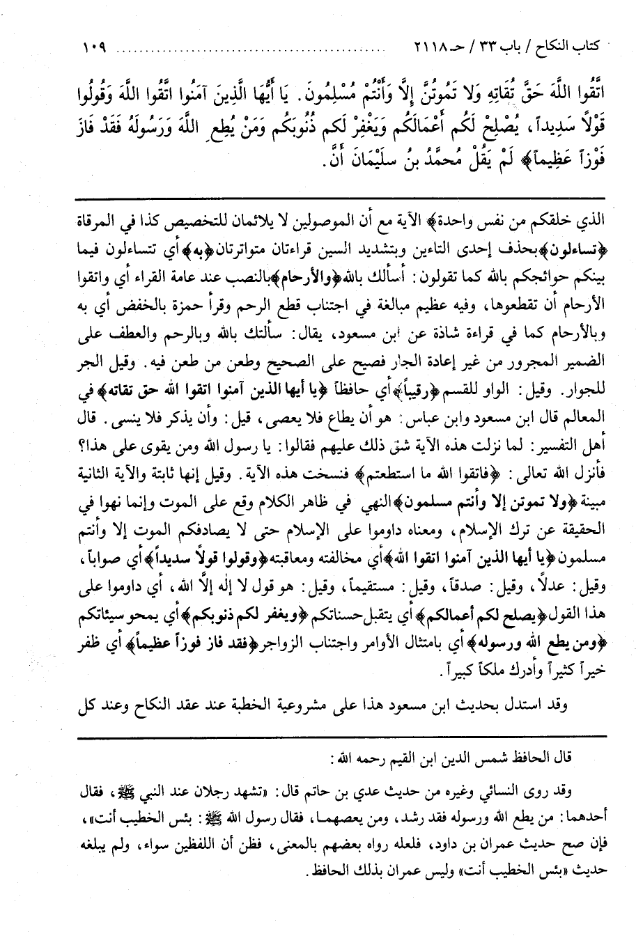 الذي خلقكم من نفس واحدة الْآيَةَ مَعَ أَنَّ الْمَوْصُولَيْنِ لَا يُلَائِمَانِ لِلتَّخْصِيصِ كَذَا فِي الْمِرْقَاةِ (تَسَّاءَلُونَ) بِحَذْفِ إِحْدَى التَّاءَيْنِ وَبِتَشْدِيدِ السِّينِ قِرَاءَتَانِ مُتَوَاتِرَتَانِ (بِهِ) أَيْ تَتَسَاءَلُونَ فِيمَا بَيْنَكُمْ حَوَائِجَكُمْ بَاللَّهِ كَمَا تَقُولُونَ أَسْأَلُكَ بَاللَّهِ (وَالْأَرْحَامَ) بَالنَّصْبِ عِنْدَ عَامَّةِ الْقُرَّاءِ أَيْ وَاتَّقُوا الْأَرْحَامَ أَنْ تَقْطَعُوهَا وَفِيهِ عَظِيمُ مُبَالَغَةٍ فِي اجْتِنَابِ قَطْعِ الرَّحِمِ وَقَرَأَ حَمْزَةُ بَالْخَفْضِ أَيْ بِهِ وَبَالْأَرْحَامِ كَمَا فِي قِرَاءَةٍ شَاذَّةٍ عن بن مَسْعُودٍ يُقَالُ سَأَلْتُكَ بَاللَّهِ وَبَالرَّحِمِ وَالْعَطْفُ عَلَى الضمير المجرور من غير إعادة الجار فصيح عَلَى الصَّحِيحِ وَطَعَنَ مَنْ طَعَنَ فِيهِ