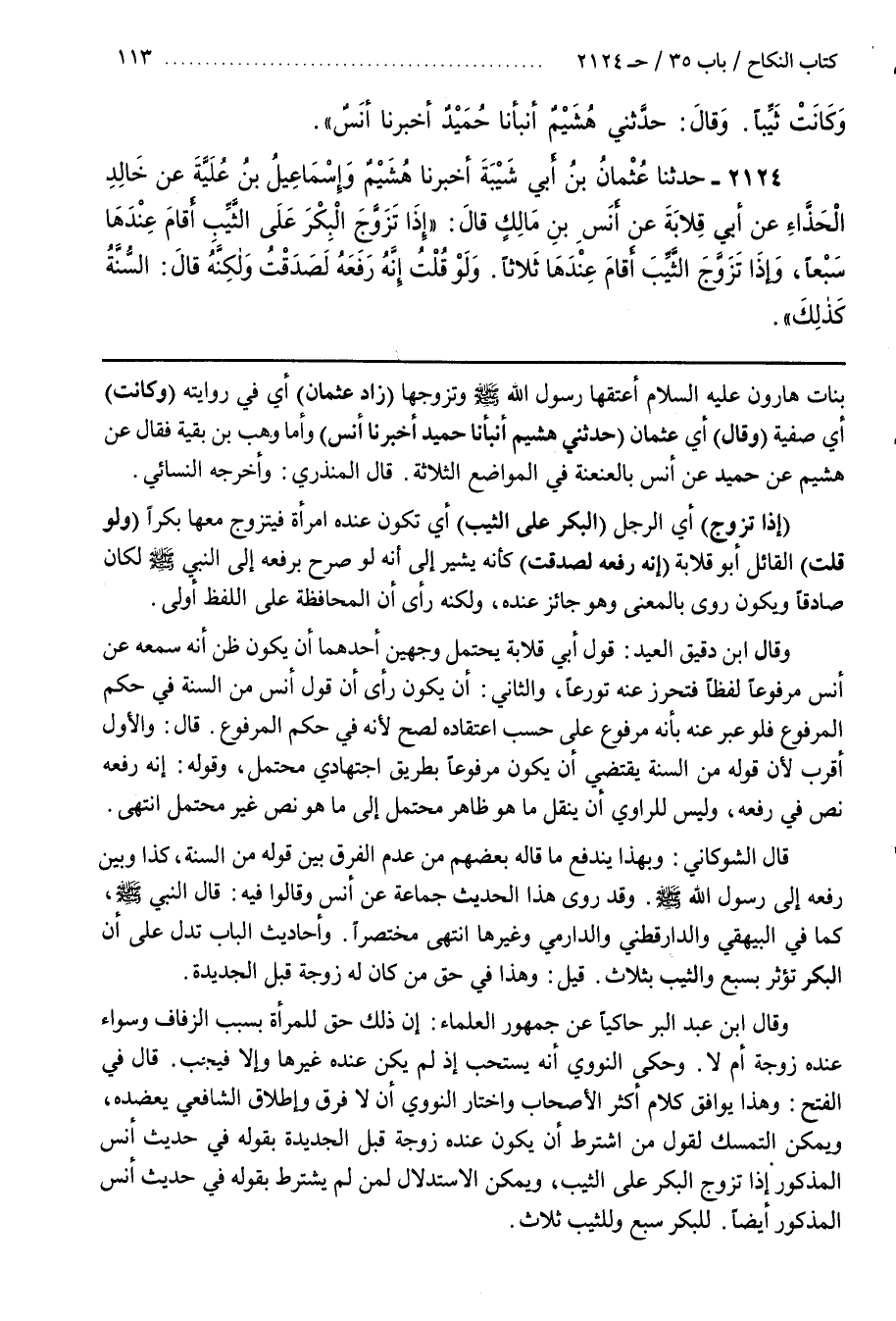 [2124] (إِذَا تَزَوَّجَ) أَيِ الرَّجُلُ (الْبِكْرَ عَلَى الثَّيِّبِ) أَيْ تَكُونُ عِنْدَهُ امْرَأَةٌ فَيَتَزَوَّجُ مَعَهَا بِكْرًا (وَلَوْ قُلْتَ) الْقَائِلُ أَبُو قِلَابَةَ (إِنَّهُ رَفَعَهُ لَصَدَقْتَ) كَأَنَّهُ يُشِيرُ إِلَى أَنَّهُ لَوْ صَرَّحَ بِرَفْعِهِ إِلَى النَّبِيِّ صَلَّى اللَّهُ عَلَيْهِ وَسَلَّمَ لَكَانَ صَادِقًا وَيَكُونُ رُوِيَ بَالْمَعْنَى وَهُوَ جَائِزٌ عِنْدَهُ وَلَكِنَّهُ رَأَى أَنَّ الْمُحَافَظَةَ عَلَى اللَّفْظِ أَوْلَى