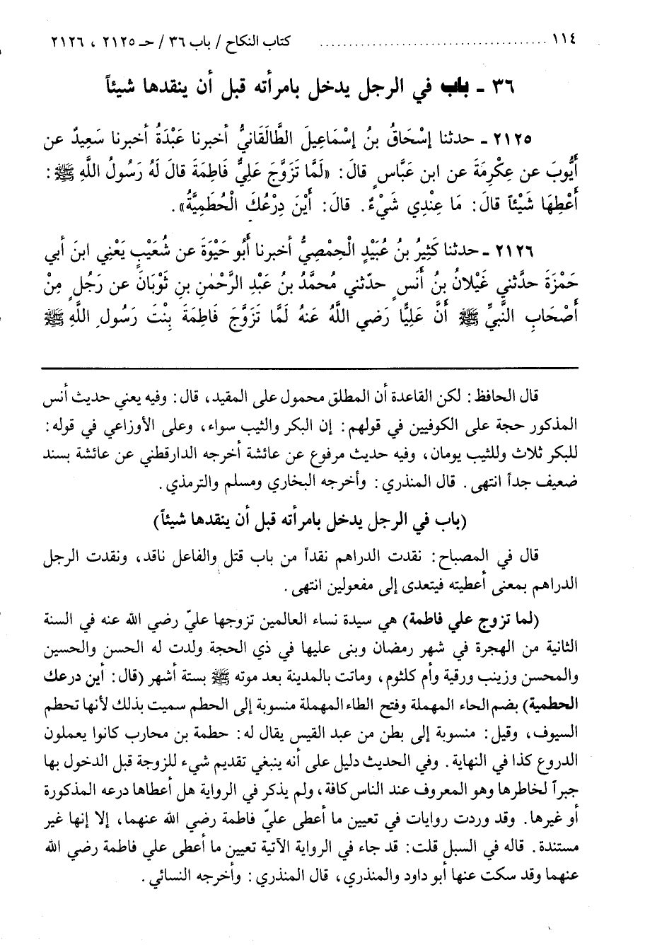 (لَمَّا تَزَوَّجَ عَلِيٌّ فَاطِمَةَ) هِيَ سَيِّدَةُ نِسَاءِ الْعَالَمِينَ تَزَوَّجَهَا عَلِيٌّ رَضِيَ اللَّهُ عَنْهُ فِي السَّنَةِ الثَّانِيَةِ مِنَ الْهِجْرَةِ فِي شَهْرِ رَمَضَانَ وَبَنَى عَلَيْهَا فِي ذِي الْحِجَّةِ وَلَدَتْ لَهُ الْحَسَنَ وَالْحُسَيْنَ وَالْمُحْسِنَ وَزَيْنَبَ وَرُقَيَّةَ وَأُمَّ كُلْثُومٍ وَمَاتَتْ بَالْمَدِينَةِ بَعْدَ مَوْتِهِ صَلَّى اللَّهُ عَلَيْهِ وَسَلَّمَ بِسِتَّةِ أَشْهُرٍ (قَالَ أَيْنَ دِرْعُكَ الْحُطَمِيَّةُ) بِضَمِّ الْحَاءِ الْمُهْمَلَةِ وَفَتْحِ الطَّاءِ الْمُهْمَلَةِ مَنْسُوبَةٌ إِلَى الْحُطَمِ سُمِّيَتْ بِذَلِكَ لِأَنَّهَا تَحْطِمُ السُّيُوفَ وَقِيلَ مَنْسُوبَةٌ إِلَى بَطْنٍ مِنْ عَبْدِ الْقَيْسِ يُقَالُ لَهُ حُطَمَةُ بْنُ مُحَارِبٍ كَانُوا يَعْمَلُونَ الدُّرُوعَ كَذَا فِي النِّهَايَةِ