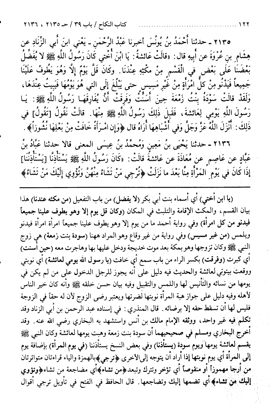 [2135] (ياابن أُخْتِي) أَيْ أَسْمَاءُ بِنْتُ أَبِي بَكْرٍ (لَا يُفَضِّلُ) مِنْ بَابِ التَّفْعِيلِ (مِنْ مُكْثِهِ عِنْدنَا) هَذَا بَيَانُ الْقَسْمِ وَالْمُكْثُ الْإِقَامَةُ وَالتَّلَبُّثُ فِي الْمَكَانِ (وَكَانَ قَلَّ يَوْمٌ إِلَّا وَهُوَ يَطُوفُ عَلَيْنَا جَمِيعًا فَيَدْنُو مِنْ كُلِّ امْرَأَةٍ) وَفِي رِوَايَةِ أَحْمَدَ مَا مِنْ يَوْمٍ إِلَّا وَهُوَ يَطُوفُ عَلَيْنَا جَمِيعًا امْرَأَةً امْرَأَةً فَيَدْنُو وَيَلْمِسُ (مِنْ غَيْرِ مَسِيسٍ) وَفِي رِوَايَةٍ مِنْ غَيْرِ وقاع وهو المراد ها هنا (سَوْدَةُ بِنْتُ زَمْعَةَ) هِيَ زَوْجُ النَّبِيِّ صَلَّى اللَّهُ عَلَيْهِ وَسَلَّمَ وَكَانَ تَزَوَّجَهَا وَهُوَ بِمَكَّةَ بَعْدَ مَوْتِ خَدِيجَةَ وَدَخَلَ عَلَيْهَا بِهَا وَهَاجَرَتْ مَعَهُ (حِينَ أَسَنَّتْ) أَيْ كَبِرَتْ (وَفَرِقَتْ) بِكَسْرِ الراء من باب سمع أي خافت (يارسول الله يومي لعائشة) أي نوبتي ووقعت بيتوتي لِعَائِشَةَ وَالْحَدِيثُ فِيهِ دَلِيلٌ عَلَى أَنَّهُ يَجُوزُ لِلرَّجُلِ الدُّخُولُ عَلَى مَنْ لَمْ يَكُنْ فِي يَوْمِهَا مِنْ نِسَائِهِ وَالتَّأْنِيسُ لَهَا وَاللَّمْسُ وَالتَّقْبِيلُ وَفِيهِ بَيَانُ حُسْنِ خُلُقِهِ صَلَّى اللَّهُ عَلَيْهِ وَسَلَّمَ وَأَنَّهُ كَانَ خَيْرَ النَّاسِ لِأَهْلِهِ وَفِيهِ دَلِيلٌ عَلَى جَوَازِ هِبَةِ الْمَرْأَةِ نَوْبَتَهَا لِضَرَّتِهَا ويعتبر رضي الزَّوْجِ وَلِأَنَّ لَهُ حَقًّا فِي الزَّوْجَةِ فَلَيْسَ لَهَا أَنْ تُسْقِطَ حَقَّهُ إِلَّا بِرِضَائِهِ