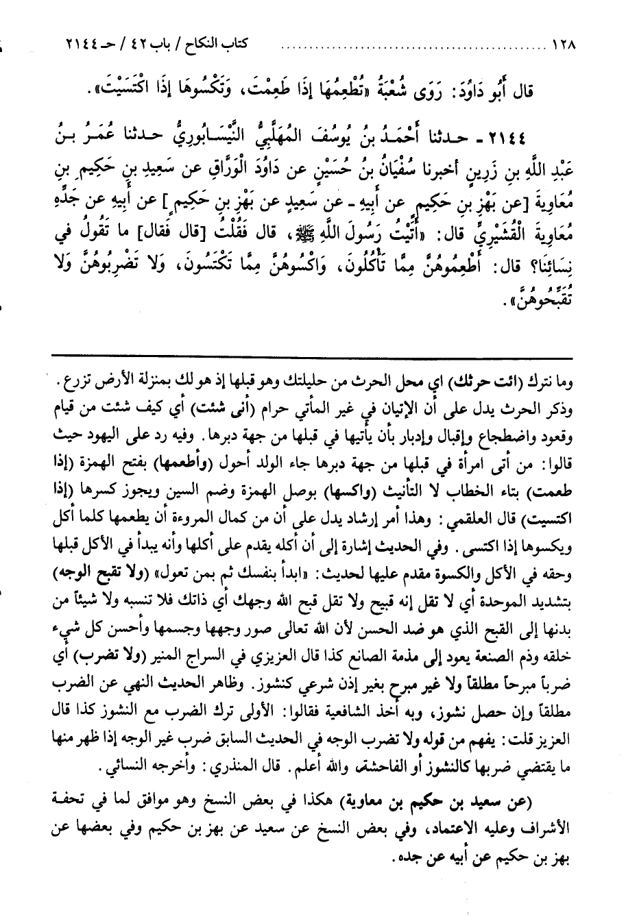 [2144] (عَنْ سَعِيدِ بْنِ حَكِيمِ بْنِ مُعَاوِيَةَ) هَكَذَا فِي بَعْضِ النُّسَخِ وَهُوَ مُوَافِقٌ لِمَا فِي تُحْفَةِ الْأَشْرَافِ وَعَلَيْهِ الِاعْتِمَادُ وَفِي بَعْضِ النُّسَخِ عَنْ سَعِيدٍ عَنْ بَهْزِ بْنِ حَكِيمٍ وَفِي بَعْضِهَا عَنْ بَهْزِ بْنِ حَكِيمٍ عَنْ أَبِيهِ عَنْ جَدِّهِ