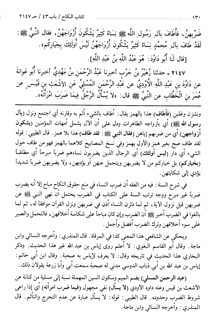 [2147] (عَبْدُ الرَّحْمَنِ الْمُسْلِيُّ) بِضَمِّ الْمِيمِ وَسُكُونِ السِّينِ الْمُهْمَلَةِ نِسْبَةً إِلَى مُسْلِيَةَ مِنْ كِنَانَةَ عَنِ الْأَشْعَثِ بْنِ قَيْسٍ وَعَنْهُ دَاوُدُ الْأَوْدِيُّ (لَا يُسْأَلُ) نَفْيُ مَجْهُولٍ (فِيمَا ضَرَبَ امْرَأَتَهُ) أَيْ إِذَا رَاعَى شُرُوطَ الضَّرْبِ وَحُدُودَهُ