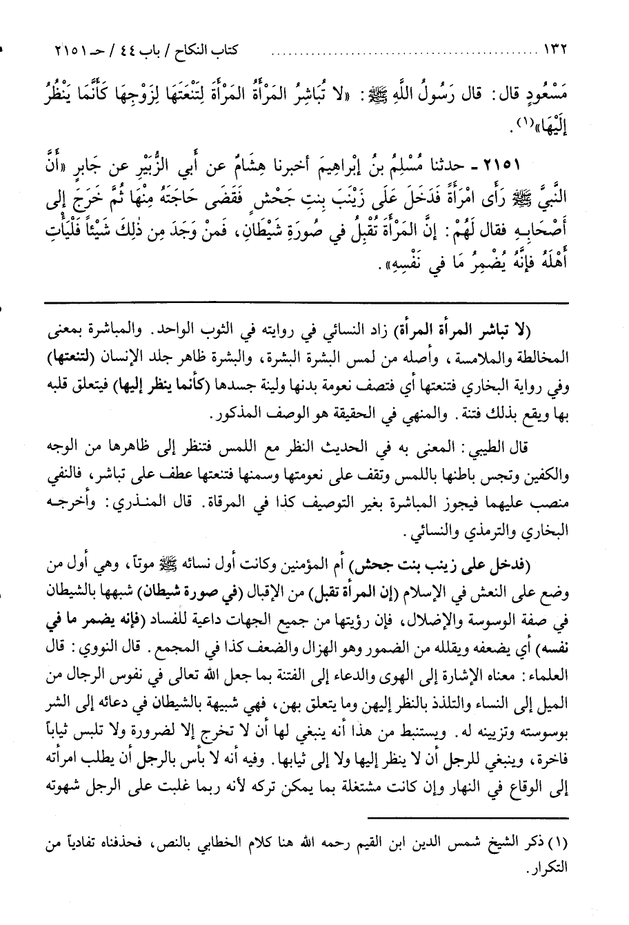 [2151] (فَدَخَلَ عَلَى زَيْنَبَ بِنْتِ جَحْشٍ) أُمِّ الْمُؤْمِنِينَ وَكَانَتْ أَوَّلَ نِسَائِهِ صَلَّى اللَّهُ عَلَيْهِ وَسَلَّمَ مَوْتًا وَهِيَ أَوَّلُ مَنْ وُضِعَ عَلَى النَّعْشِ فِي الْإِسْلَامِ (إِنَّ الْمَرْأَةَ تُقْبِلُ) مِنَ الْإِقْبَالِ (فِي صُورَةِ شَيْطَانٍ) شَبَّهَهَا بَالشَّيْطَانِ فِي صِفَةِ الْوَسْوَسَةِ وَالْإِضْلَالِ فَإِنَّ رُؤْيَتَهَا مِنْ جَمِيعِ الْجِهَاتِ دَاعِيَةٌ لِلْفَسَادِ (فَإِنَّهُ يُضْمِرُ مَا فِي نَفْسِهِ) أَيْ يُضْعِفُهُ وَيُقَلِّلُهُ مِنَ الضُّمُورِ وَهُوَ الْهُزَالُ وَالضَّعْفُ كَذَا فِي الْمَجْمَعِ
