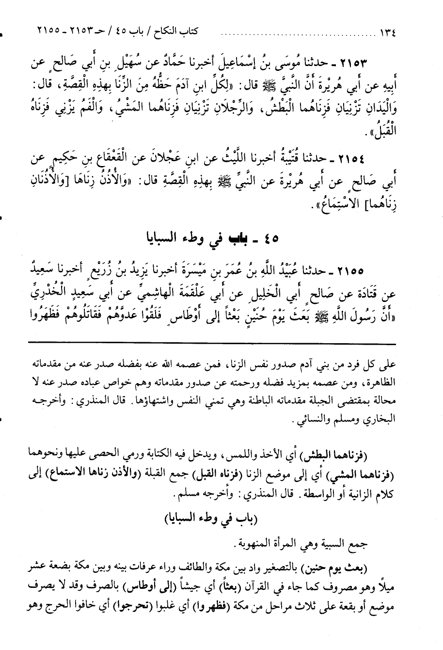 [2153] (فَزِنَاهُمَا الْبَطْشُ) أَيِ الْأَخْذُ وَاللَّمْسُ وَيَدْخُلُ فِيهِ الْكِتَابَةُ وَرَمْيُ الْحَصَى عَلَيْهَا وَنَحْوُهُمَا (فزناهما المشي) أي إلى موضع الزنى (فَزِنَاهُ الْقُبَلُ) جَمْعُ الْقُبْلَةُ