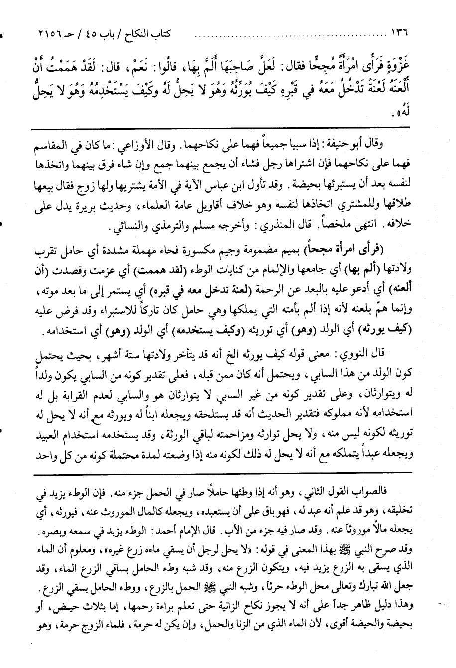 [2156] (فَرَأَى امْرَأَةً مُجِحًّا) بِمِيمٍ مَضْمُومَةٍ وَجِيمٍ مَكْسُورَةٍ فَحَاءٍ مُهْمَلَةٍ مُشَدَّدَةٍ أَيْ حَامِلٌ تَقْرُبُ وِلَادَتُهَا (أَلَمَّ بِهَا) أَيْ جَامَعَهَا وَالْإِلْمَامُ مِنْ كِنَايَاتِ الْوَطْءِ (لَقَدْ هَمَمْتُ) أَيْ عَزَمْتُ وَقَصَدْتُ (أَنْ أَلْعَنَهُ) أَيْ أَدْعُوَ عَلَيْهِ بَالْبُعْدِ عَنِ الرَّحْمَةِ (لَعْنَةً تَدْخُلُ مَعَهُ فِي قَبْرِهِ) أَيْ يَسْتَمِرُّ إِلَى مَا بَعْدَ مَوْتِهِ وَإِنَّمَا هَمَّ بِلَعْنِهِ لِأَنَّهُ إِذَا أَلَمَّ بِأَمَتِهِ الَّتِي يَمْلِكُهَا وَهِيَ حَامِلٌ كَانَ تَارِكًا لِلِاسْتِبْرَاءِ وَقَدْ فُرِضَ عَلَيْهِ (كَيْفَ يُوَرِّثُهُ) أَيِ الْوَلَدُ (وَهُوَ) أَيْ تَوْرِيثُهُ (وَكَيْفَ يَسْتَخْدِمُهُ) أَيِ الْوَلَدُ (وَهُوَ) أَيِ اسْتِخْدَامُهُ