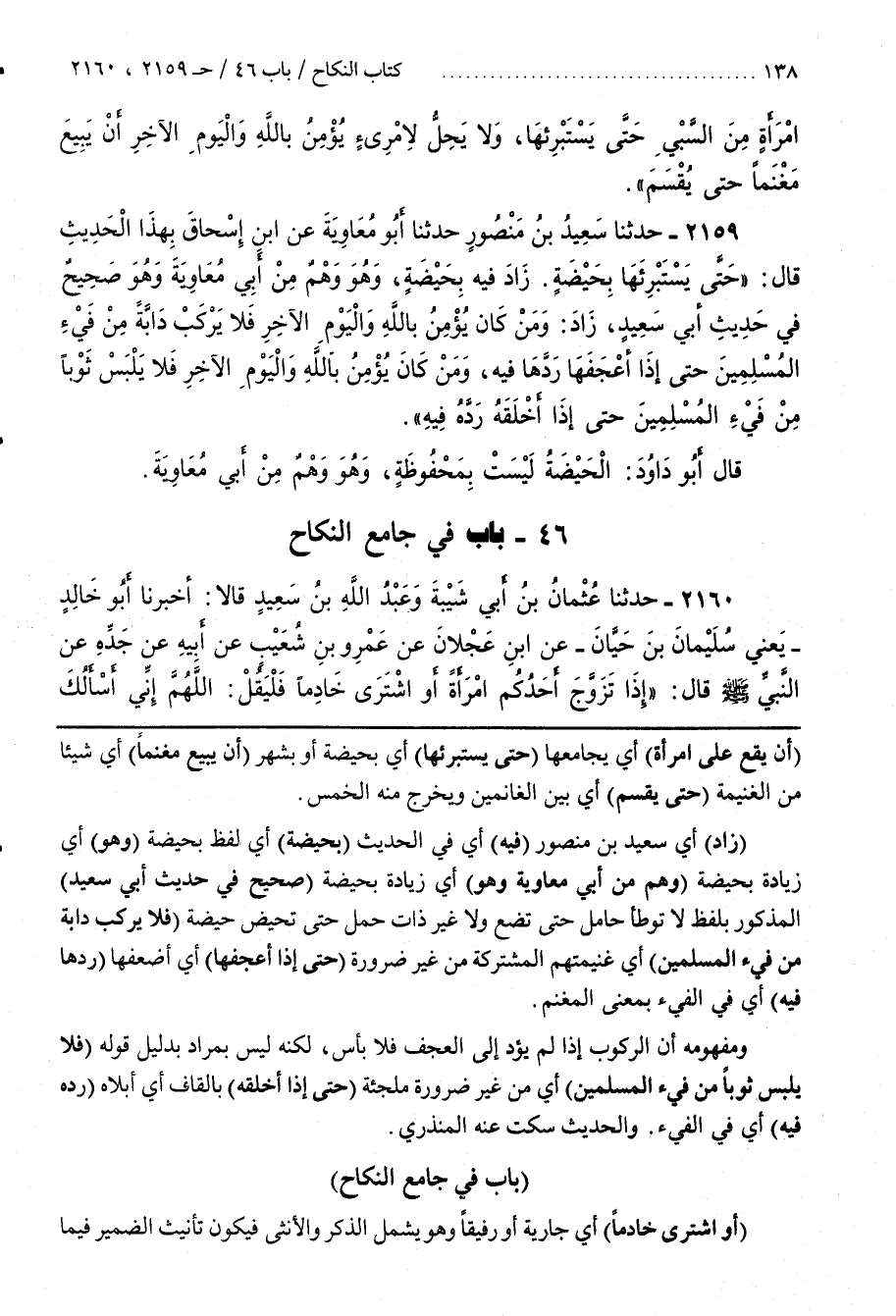[2159] (زَادَ) أَيْ سَعِيدُ بْنُ مَنْصُورٍ (فِيهِ) أَيْ فِي الْحَدِيثِ (بِحَيْضَةٍ) أَيْ لَفْظَ بِحَيْضَةٍ (وَهُوَ) أَيْ زِيَادَةُ بِحَيْضَةٍ (وَهْمٌ مِنْ أَبِي مُعَاوِيَةَ وَهُوَ) أَيْ زِيَادَةُ بِحَيْضَةٍ (صَحِيحٌ فِي حَدِيثِ أَبِي سَعِيدٍ) الْمَذْكُورِ بِلَفْظِ لَا تُوطَأُ حَامِلٌ حَتَّى تَضَعَ وَلَا غَيْرَ ذَاتِ حَمْلٍ حَتَّى تَحِيضَ حَيْضَةً (فَلَا يَرْكَبُ دَابَّةً مِنْ فَيْءِ الْمُسْلِمِينَ) أَيْ غَنِيمَتِهِمُ الْمُشْتَرَكَةِ مِنْ غَيْرِ ضَرُورَةٍ (حَتَّى إِذَا أَعْجَفَهَا) أَيْ أَضْعَفَهَا (رَدَّهَا فِيهِ) أَيْ فِي الْفَيْءِ بِمَعْنَى الْمَغْنَمِ