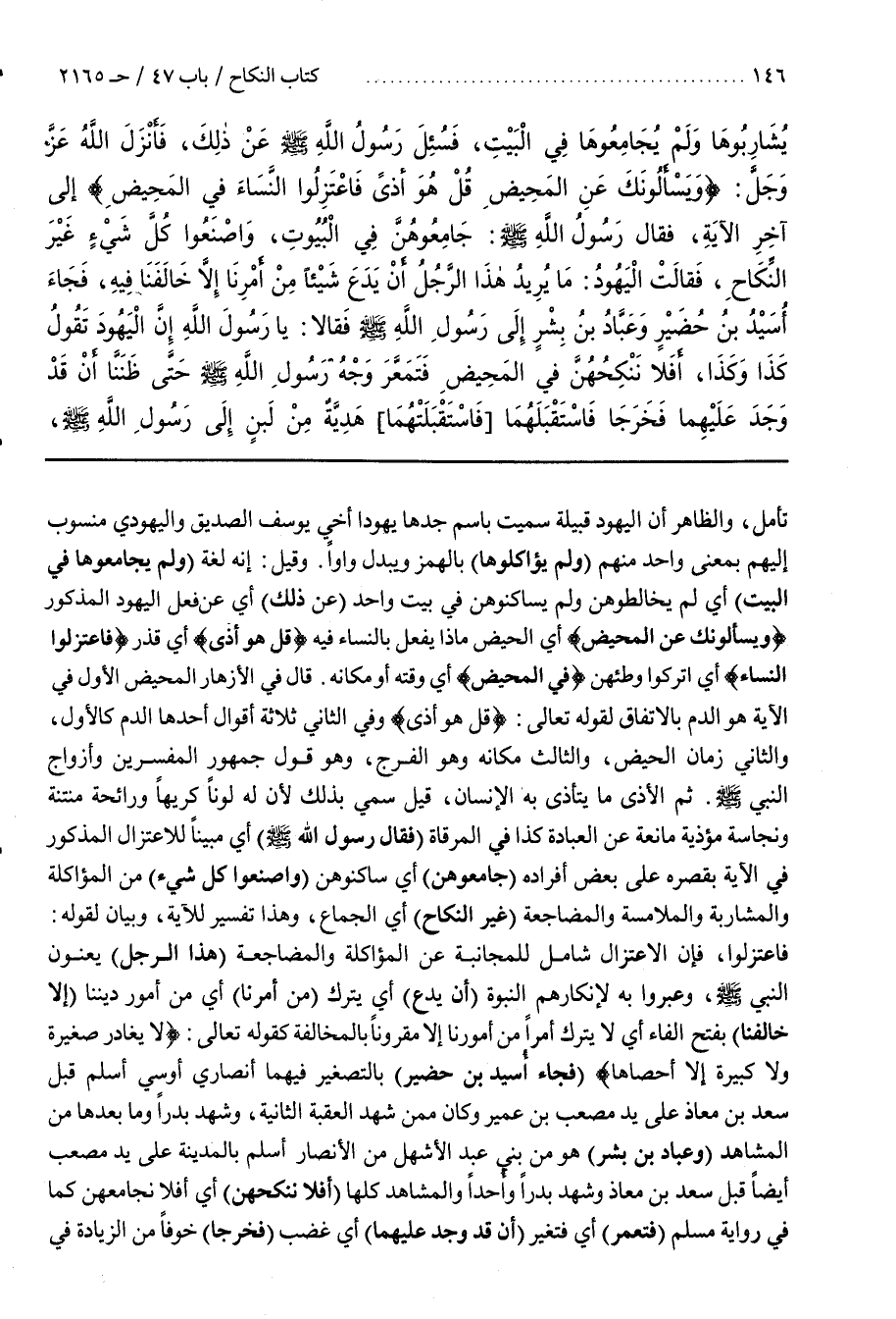 ثُمَّ الْأَذَى مَا يَتَأَذَّى بِهِ الْإِنْسَانُ قِيلَ سُمِّيَ بِذَلِكَ لِأَنَّ لَهُ لَوْنًا كَرِيهًا وَرَائِحَةً مُنْتِنَةً وَنَجَاسَةً مُؤْذِيَةً مَانِعَةً عَنِ الْعِبَادَةِ كَذَا فِي الْمِرْقَاةِ (فَقَالَ رَسُولُ اللَّهِ صَلَّى اللَّهُ عَلَيْهِ وَسَلَّمَ) أَيْ مُبَيِّنًا لِلِاعْتِزَالِ الْمَذْكُورِ فِي الْآيَةِ بِقَصْرِهِ عَلَى بَعْضِ أَفْرَادِهِ (جَامِعُوهُنَّ) أَيْ سَاكِنُوهُنَّ (وَاصْنَعُوا كُلَّ شَيْءٍ) مِنَ الْمُؤَاكَلَةِ وَالْمُشَارَبَةِ وَالْمُلَامَسَةِ وَالْمُضَاجَعَةِ (غَيْرَ النِّكَاحِ) أَيِ الْجِمَاعِ وَهَذَا تَفْسِيرٌ لِلْآيَةِ وَبَيَانٌ لِقَوْلِهِ فَاعْتَزِلُوا فَإِنَّ الِاعْتِزَالَ شَامِلٌ لِلْمُجَانَبَةِ عَنِ الْمُؤَاكَلَةِ وَالْمُضَاجَعَةِ (هَذَا الرَّجُلُ) يَعْنُونَ النَّبِيَّ صَلَّى اللَّهُ عليه وسلم وعبروا به لِإِنْكَارِهِمُ النُّبُوَّةَ (أَنْ يَدَعَ) أَيْ يَتْرُكَ (مِنْ أَمْرِنَا) أَيْ مِنْ أُمُورِ دِينِنَا (إِلَّا خَالَفَنَا) بِفَتْحِ الْفَاءِ أَيْ لَا يَتْرُكُ أَمْرًا مِنْ أُمُورِنَا إِلَّا مَقْرُونًا بَالْمُخَالَفَةِ كَقَوْلِهِ تَعَالَى لَا يغادر صغيرة ولا كبيرة إلا أحصاها (فَجَاءَ أُسَيْدُ بْنُ حُضَيْرٍ) بَالتَّصْغِيرِ فِيهِمَا أَنْصَارِيٌّ أَوْسِيٌّ أَسْلَمَ قَبْلَ سَعْدِ بْنِ مُعَاذٍ عَلَى يَدِ مُصْعَبِ بْنِ عُمَيْرٍ وَكَانَ مِمَّنْ شَهِدَ الْعَقَبَةَ الثَّانِيَةَ وَشَهِدَ بَدْرًا وَمَا بَعْدَهَا مِنَ الْمَشَاهِدِ (وَعَبَّادُ بْنُ بِشْرٍ) هُوَ مِنْ بَنِي عَبْدِ الْأَشْهَلِ مِنَ الْأَنْصَارِ أَسْلَمَ بَالْمَدِينَةِ عَلَى يَدِ مُصْعَبٍ أَيْضًا قَبْلَ سَعْدِ بْنِ مُعَاذٍ وَشَهِدَ بَدْرًا وَأُحُدًا وَالْمَشَاهِدَ كُلَّهَا (أَفَلَا نَنْكِحُهُنَّ) أَيْ أَفَلَا نُجَامِعُهُنَّ كَمَا فِي رِوَايَةِ مُسْلِمٍ (فَتَمَعَّرَ) أَيْ فَتَغَيَّرَ (أَنْ قَدْ وَجَدَ عَلَيْهِمَا) أَيْ غَضِبَ (فَخَرَجَا) خَوْفًا مِنَ الزِّيَادَةِ فِي