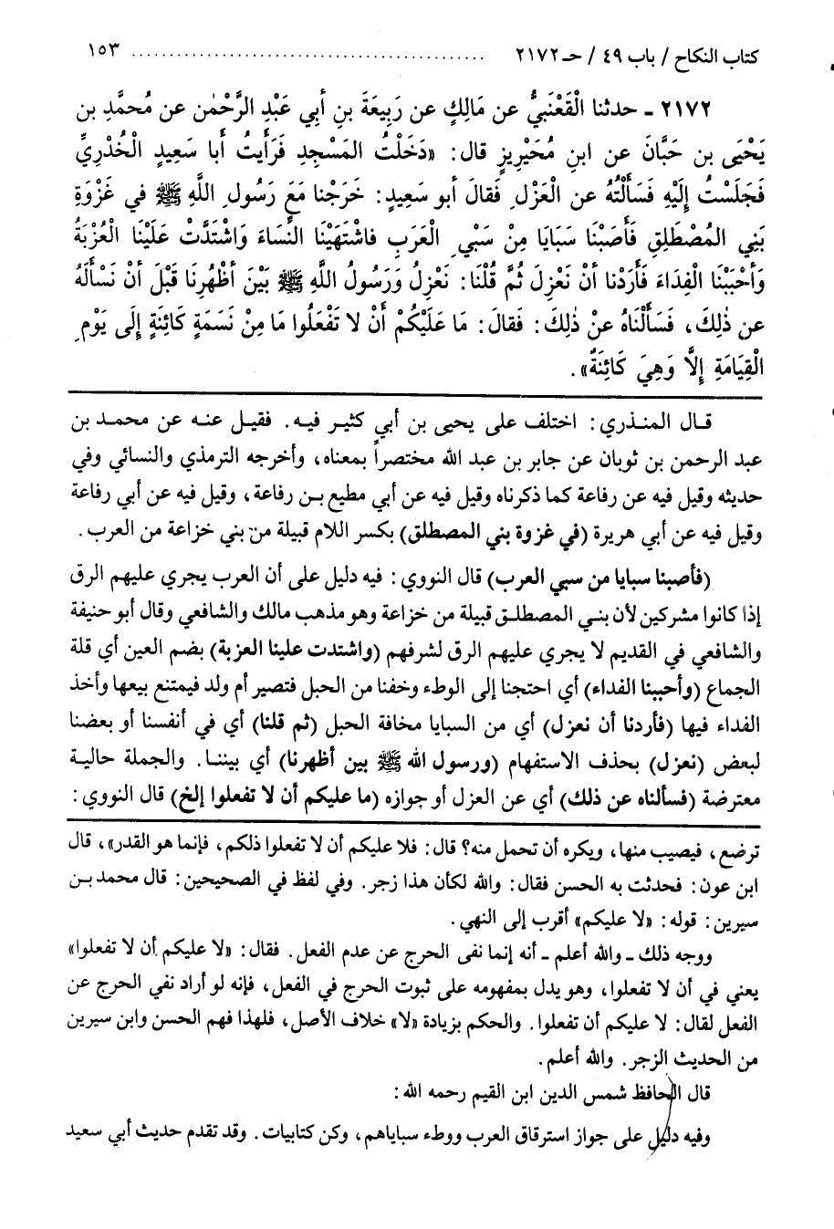 [2172] (فَأَصَبْنَا سَبَايَا مِنْ سَبْيِ الْعَرَبِ) قَالَ النَّوَوِيُّ فِيهِ دَلِيلٌ عَلَى أَنَّ الْعَرَبَ يجري عليهم الرق إذا كانوا الشركين لِأَنَّ بَنِي الْمُصْطَلِقِ قَبِيلَةٌ مِنْ خُزَاعَةَ وَهُوَ مَذْهَبُ مَالِكٍ وَالشَّافِعِيِّ وَقَالَ أَبُو حَنِيفَةَ وَالشَّافِعِيُّ فِي الْقَدِيمِ لَا يَجْرِي عَلَيْهِمُ الرِّقُّ لِشَرَفِهِمْ (وَاشْتَدَّتْ عَلَيْنَا الْعُزْبَةُ) بِضَمِّ الْعَيْنِ أَيْ قِلَّةُ الْجِمَاعِ (وَأَحْبَبْنَا الْفِدَاءَ) أَيِ احْتَجْنَا إِلَى الْوَطْءِ وَخِفْنَا مِنَ الْحَبَلِ فَتَصِيرُ أُمَّ وَلَدٍ فَيَمْتَنِعُ بَيْعُهَا وَأَخْذُ الْفِدَاءِ فِيهَا (فَأَرَدْنَا أَنْ نَعْزِلَ) أَيْ مِنَ السَّبَايَا مَخَافَةَ الْحَبَلِ (ثُمَّ قُلْنَا) أَيْ فِي أَنْفُسِنَا أَوْ بَعْضُنَا لِبَعْضٍ (نَعْزِلُ) بِحَذْفِ الِاسْتِفْهَامِ (وَرَسُولُ اللَّهِ صَلَّى اللَّهُ عَلَيْهِ وَسَلَّمَ بَيْنَ أَظْهُرِنَا) أَيْ بَيْنَنَا