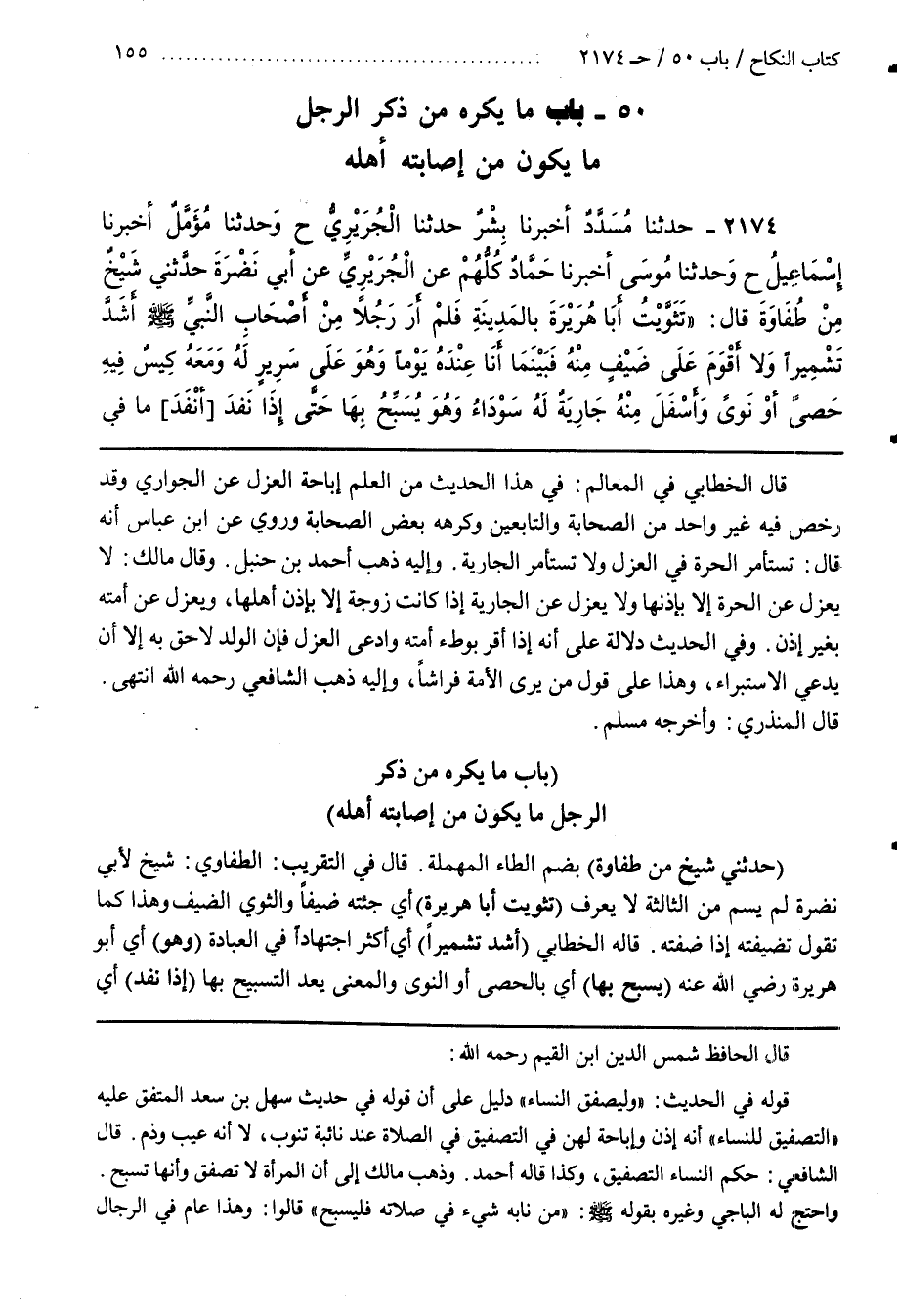 قَالَ الْخَطَّابِيُّ فِي الْمَعَالِمِ فِي هَذَا الْحَدِيثِ مِنَ الْعِلْمِ إِبَاحَةُ الْعَزْلِ عَنِ الْجَوَارِي وَقَدْ رَخَّصَ فِيهِ غَيْرُ وَاحِدٍ مِنَ الصَّحَابَةِ وَالتَّابِعِينَ وكرهه بعض الصحابة وروي عن بن عَبَّاسٍ أَنَّهُ قَالَ تُسْتَأْمَرُ الْحُرَّةُ فِي الْعَزْلِ وَلَا تُسْتَأْمَرُ الْجَارِيَةُ