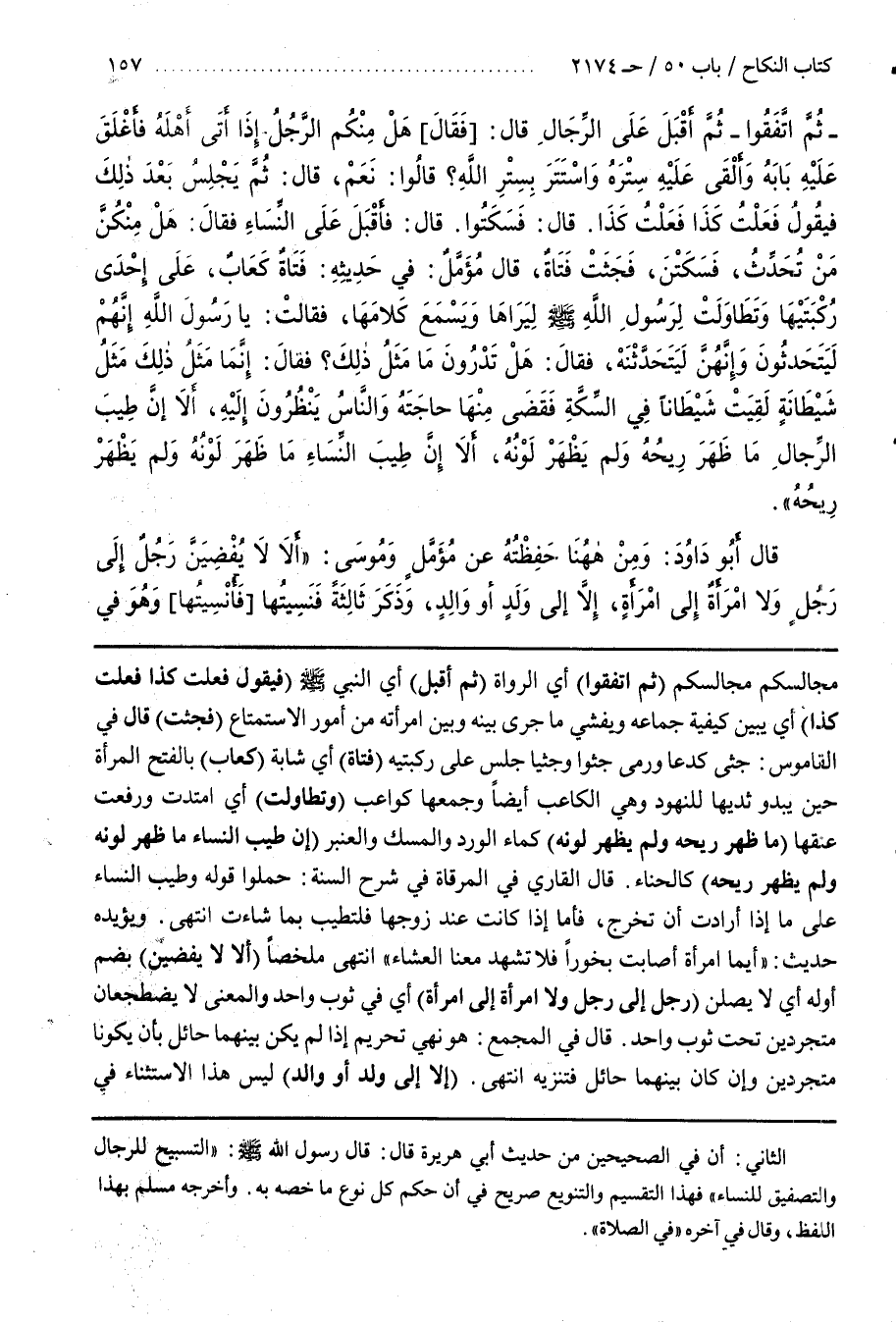 وَيُؤَيِّدُهُ حَدِيثُ أَيُّمَا امْرَأَةٍ أَصَابَتْ بَخُورًا فَلَا تَشْهَدْ مَعَنَا الْعِشَاءَ انْتَهَى مُلَخَّصًا (أَلَا لَا يُفْضِيَنَّ) بِضَمِّ أَوَّلِهِ أَيْ لَا يَصِلَنَّ (رَجُلٌ إِلَى رَجُلٍ وَلَا امْرَأَةٌ إِلَى امْرَأَةٍ) أَيْ فِي ثَوْبٍ وَاحِدٍ وَالْمَعْنَى لَا يَضْطَجِعَانِ مُتَجَرِّدَيْنِ تَحْتَ ثَوْبٍ وَاحِدٍ