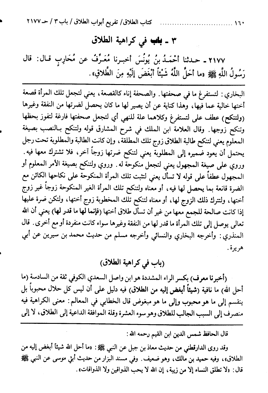 [2177] (أَخْبَرَنَا مُعَرِّفٌ) بِكَسْرِ الراء المشددة هو بن وَاصِلٍ السَّعْدِيُّ الْكُوفِيُّ ثِقَةٌ مِنَ السَّادِسَةِ (مَا أَحَلَّ اللَّهُ) مَا نَافِيَةٌ (شَيْئًا أَبْغَضُ إِلَيْهِ مِنَ الطَّلَاقِ) فِيهِ دَلِيلٌ عَلَى أَنْ لَيْسَ كُلُّ حَلَالٍ مَحْبُوبًا بَلْ يَنْقَسِمُ إِلَى مَا هُوَ مَحْبُوبٌ وَإِلَى مَا هُوَ مَبْغُوضٌ قَالَ الْخَطَّابِيُّ فِي الْمَعَالِمِ مَعْنَى الْكَرَاهِيَةِ فِيهِ مُنْصَرِفٌ إِلَى السَّبَبِ الْجَالِبِ لِلطَّلَاقِ وَهُوَ سُوءُ الْعِشْرَةِ وَقِلَّةُ الْمُوَافَقَةِ الدَّاعِيَةِ إِلَى الطَّلَاقِ لَا إِلَى
