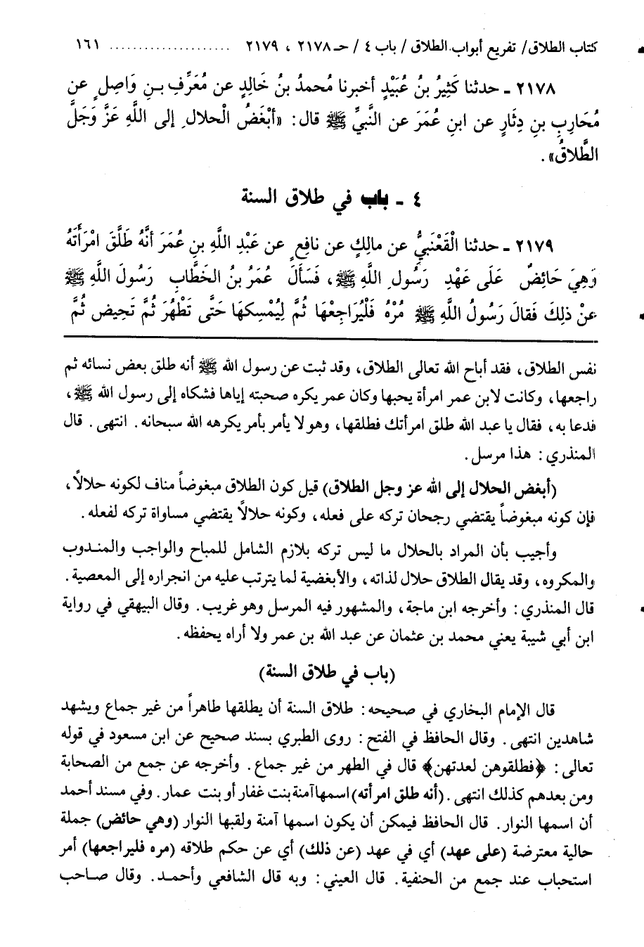 [2178] (أَبْغَضُ الْحَلَالِ إِلَى اللَّهِ عَزَّ وَجَلَّ الطَّلَاقُ) قِيلَ كَوْنُ الطَّلَاقِ مَبْغُوضًا مُنَافٍ لِكَوْنِهِ حَلَالًا فَإِنَّ كَوْنَهُ مَبْغُوضًا يَقْتَضِي رُجْحَانَ تَرْكِهِ عَلَى فِعْلِهِ وَكَوْنُهُ حَلَالًا يَقْتَضِي مُسَاوَاةَ تَرْكِهِ لِفِعْلِهِ
