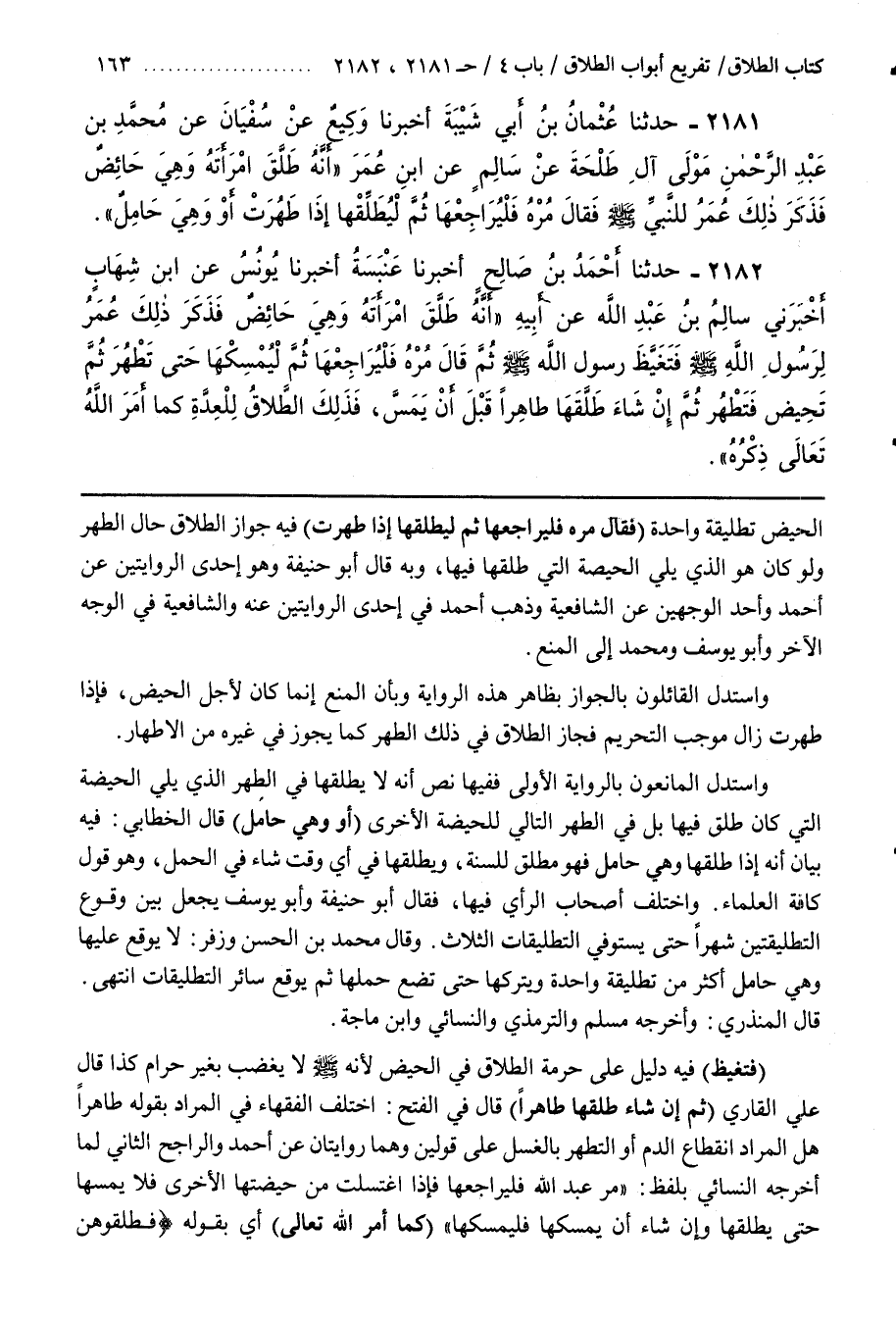 [2181] (فَقَالَ مُرْهُ فَلْيُرَاجِعْهَا ثُمَّ لْيُطَلِّقْهَا إِذَا طَهُرَتْ) فِيهِ جَوَازُ الطَّلَاقِ حَالَ الطُّهْرِ وَلَوْ كَانَ هُوَ الَّذِي يَلِي الْحَيْضَةَ الَّتِي طَلَّقَهَا فِيهَا وَبِهِ قَالَ أَبُو حَنِيفَةَ وَهُوَ إِحْدَى الرِّوَايَتَيْنِ عَنْ أَحْمَدَ وَأَحَدُ الْوَجْهَيْنِ عَنِ الشَّافِعِيَّةِ وَذَهَبَ أَحْمَدُ فِي إِحْدَى الرِّوَايَتَيْنِ عَنْهُ وَالشَّافِعِيَّةُ فِي الْوَجْهِ الْآخَرِ وَأَبُو يُوسُفَ وَمُحَمَّدٌ إِلَى الْمَنْعِ