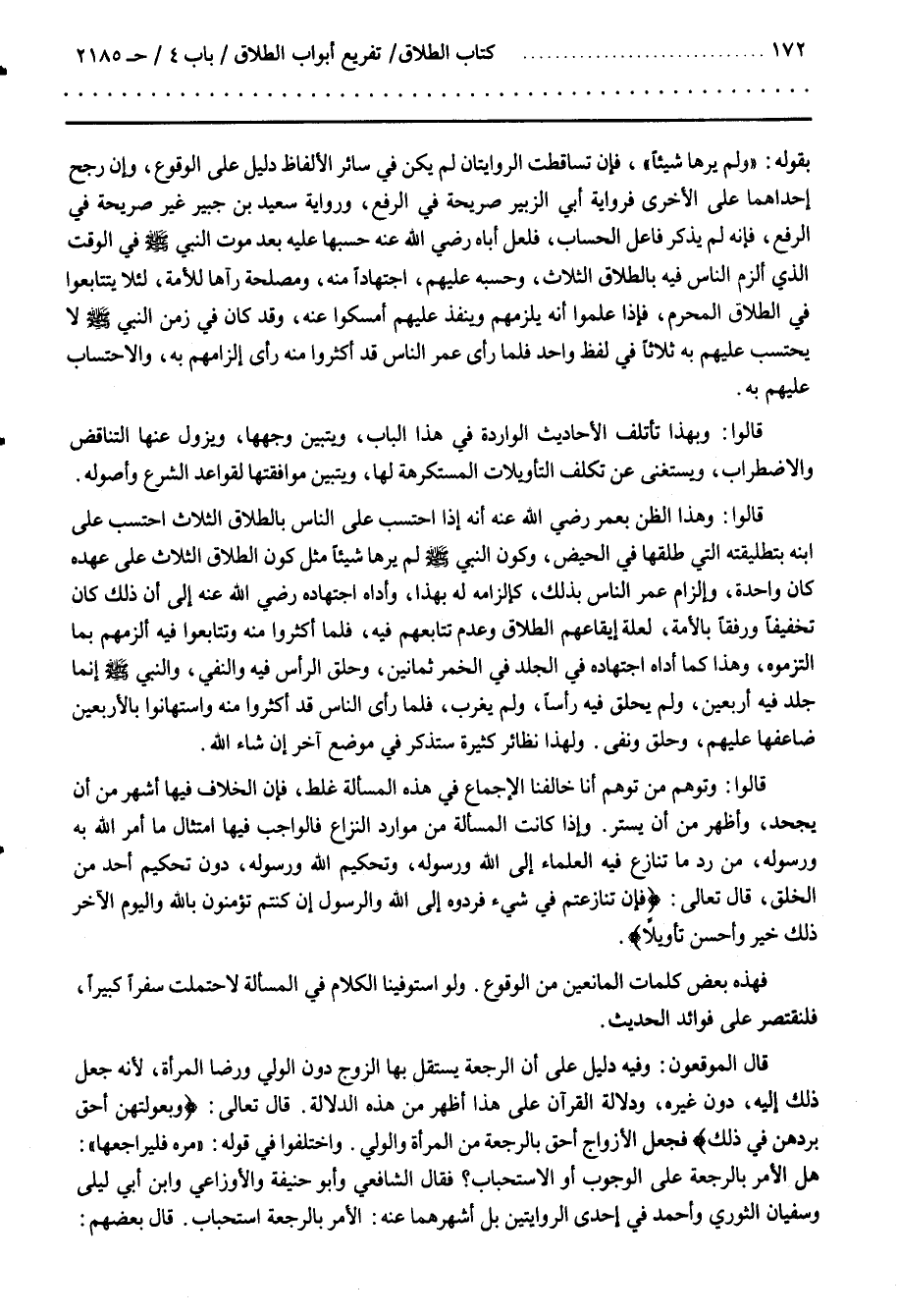 ــــــــــــQبِقَوْلِهِ وَلَمْ يَرَهَا شَيْئًا فَإِنْ تَسَاقَطَتْ الرِّوَايَتَانِ لَمْ يَكُنْ فِي سَائِر الْأَلْفَاظ دَلِيل عَلَى الْوُقُوع وَإِنْ رُجِّحَ إِحْدَاهُمَا عَلَى الْأُخْرَى فَرِوَايَة أَبِي الزُّبَيْر صَرِيحَة فِي الرَّفْع وَرِوَايَة سَعِيد بْن جُبَيْر غَيْر صَرِيحَة فِي الرَّفْع فَإِنَّهُ لم يذكر فاعل الحساب فلعل أباه رضي الله عنه حسبها عليه بعد موت النبي فِي الْوَقْت الَّذِي أَلْزَمَ النَّاس فِيهِ بِالطَّلَاقِ الثَّلَاث وَحَسِبَهُ عَلَيْهِمْ اِجْتِهَادًا مِنْهُ وَمَصْلَحَة رَآهَا لِلْأُمَّةِ لِئَلَّا يَتَتَابَعُوا فِي الطَّلَاق الْمُحَرَّم فَإِذَا عَلِمُوا أَنَّهُ يَلْزَمهُمْ وَيَنْفُذ عَلَيْهِمْ أَمْسَكُوا عَنْهُ وقد كان في زمن النبي لَا يَحْتَسِب عَلَيْهِمْ بِهِ ثَلَاثًا فِي لَفْظ وَاحِد فَلَمَّا رَأَى عُمَر النَّاس قَدْ أَكْثَرُوا مِنْهُ رَأَى إِلْزَامهمْ بِهِ وَالِاحْتِسَاب عَلَيْهِمْ بِهِ