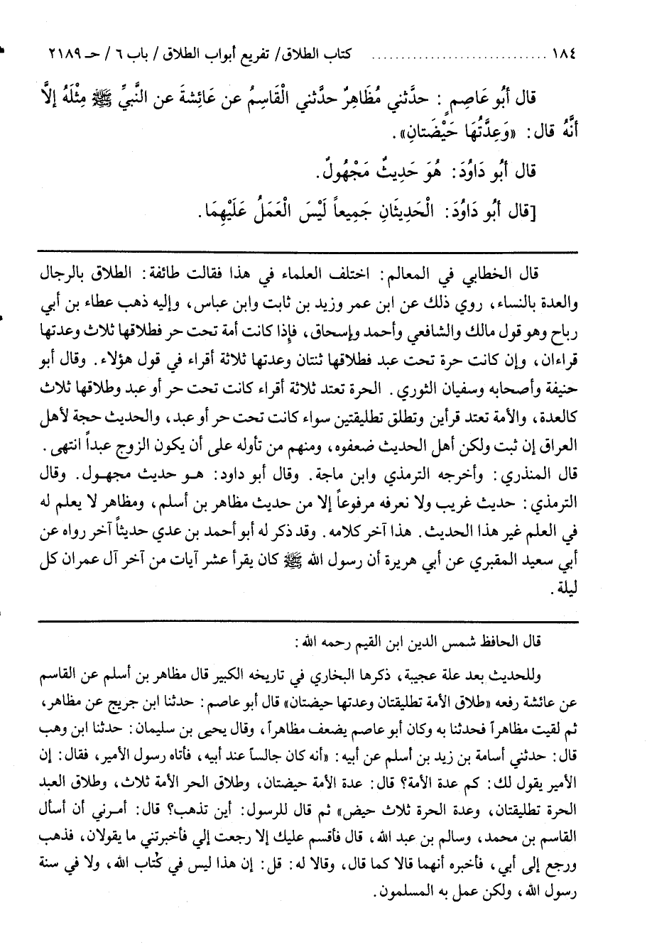 ــــــــــــQقال الحافظ شمس الدين بن القيم رحمه اللَّه وَلِلْحَدِيثِ بَعْدُ عِلَّةٌ عَجِيبَةٌ ذَكَرهَا الْبُخَارِيُّ فِي تَارِيخه الْكَبِير قَالَ مُظَاهِر بْن أَسْلَمَ عَنْ الْقَاسِم عَنْ عَائِشَة رَفَعَهُ طَلَاق الْأَمَة تَطْلِيقَتَانِ وَعِدَّتهَا حَيْضَتَانِ قَالَ أَبُو عَاصِم حَدَّثَنَا بن جُرَيْج عَنْ مُظَاهِر ثُمَّ لَقِيت مُظَاهِرًا فَحَدَّثَنَا بِهِ وَكَانَ أَبُو عَاصِم يُضَعَّف مُظَاهِرًا وَقَالَ يحيى بن سليمان حدثنا بن وَهْب قَالَ حَدَّثَنِي أُسَامَة بْن زَيْد بْن أَسْلَمَ عَنْ أَبِيهِ أَنَّهُ كَانَ جَالِسًا عِنْد أَبِيهِ فَأَتَاهُ رَسُول الْأَمِير فَقَالَ إِنَّ الْأَمِير يَقُول لَك كَمْ عِدَّة الْأَمَة قَالَ عِدَّة الْأَمَة حَيْضَتَانِ وَطَلَاق الْحُرّ الْأَمَة ثَلَاث وَطَلَاق الْعَبْد الْحُرَّة تَطْلِيقَتَانِ وَعِدَّة الْحُرَّة ثَلَاث حِيَض ثُمَّ قَالَ لِلرَّسُولِ أَيْنَ تَذْهَب قَالَ أَمَرَنِي أَنْ أَسْأَل الْقَاسِم بْن مُحَمَّد وَسَالِم بْن عَبْد اللَّه قَالَ فَأُقْسِم عَلَيْك إِلَّا رَجَعْت إِلَيَّ فَأَخْبَرْتنِي مَا يَقُولَانِ فَذَهَبَ وَرَجَعَ إِلَى أَبِي فَأَخْبَرَهُ أَنَّهُمَا قَالَا كَمَا قَالَ وَقَالَا لَهُ قُلْ إِنَّ هَذَا لَيْسَ فِي كِتَاب اللَّه وَلَا فِي سُنَّة رَسُول اللَّه وَلَكِنْ عَمِلَ بِهِ الْمُسْلِمُونَ