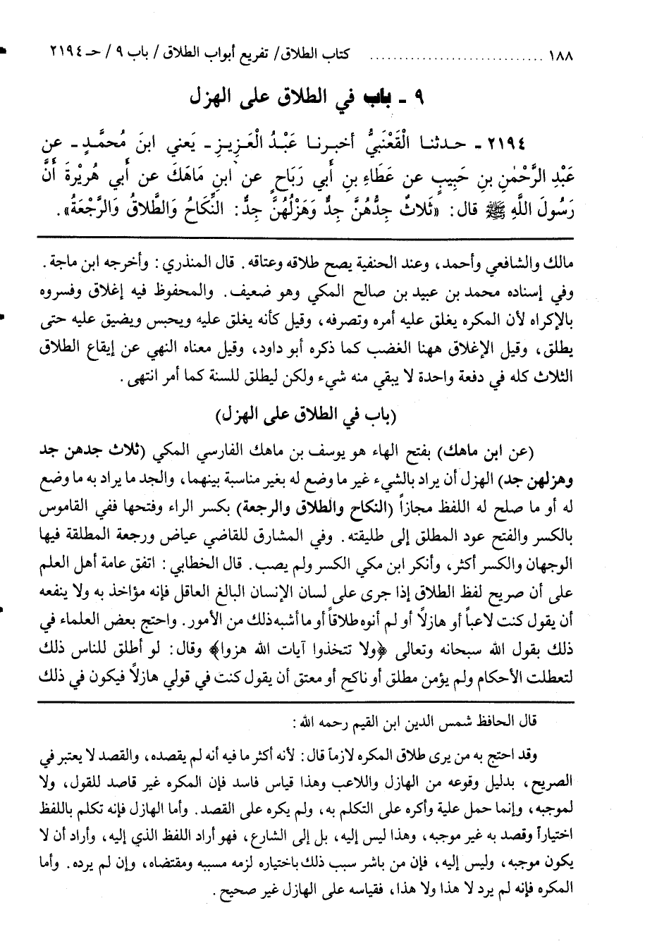 (عن بن مَاهَكَ) بِفَتْحِ الْهَاءِ هُوَ يُوسُفُ بْنُ مَاهَكَ الْفَارِسِيُّ الْمَكِّيُّ (ثَلَاثٌ جِدُّهُنَّ جِدٌّ وَهَزْلُهُنَّ جِدٌّ) الْهَزْلُ أَنْ يُرَادَ بَالشَّيْءِ غَيْرَ مَا وُضِعَ لَهُ بِغَيْرِ مُنَاسَبَةٍ بَيْنَهُمَا وَالْجِدُّ مَا يُرَادُ بِهِ مَا وُضِعَ لَهُ أَوْ مَا صَلُحَ لَهُ اللَّفْظُ مَجَازًا (النِّكَاحُ وَالطَّلَاقُ وَالرِّجْعَةُ) بِكَسْرِ الرَّاءِ وَفَتْحِهَا فَفِي الْقَامُوسِ بَالْكَسْرِ وَالْفَتْحِ عَوْدُ الْمُطَلِّقِ إِلَى طَلِيقَتِهِ