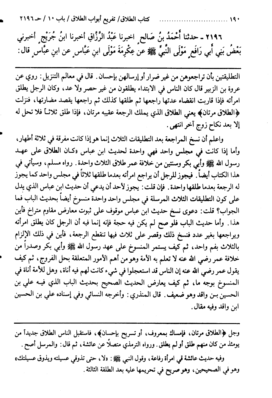 وَأَمَّا حَدِيثُ الْبَابِ فَلَوْ صَحَّ لَمْ يَكُنْ فِيهِ حُجَّةٌ فَإِنَّهُ إِنَّمَا فِيهِ أَنَّ الرَّجُلَ كَانَ يُطَلِّقُ امْرَأَتَهُ وَيُرَاجِعُهَا بِغَيْرِ عَدَدٍ فَنُسِخَ ذَلِكَ وَقُصِرَ عَلَى ثَلَاثٍ فِيهَا تَنْقَطِعُ الرَّجْعَةُ فَأَيْنَ فِي ذَلِكَ الْإِلْزَامُ بَالثَّلَاثِ بِفَمٍ وَاحِدٍ ثُمَّ كَيْفَ يَسْتَمِرُّ الْمَنْسُوخُ عَلَى عَهْدِ رَسُولِ اللَّهِ صَلَّى اللَّهُ عَلَيْهِ وسلم وَأَبِي بَكْرٍ وَصَدْرًا مِنْ خِلَافَةِ عُمَرَ رَضِيَ اللَّهُ عَنْهُ لَا تَعْلَمُ بِهِ الْأُمَّةُ وَهُوَ مِنْ أَهَمِّ الْأُمُورِ الْمُتَعَلِّقَةِ بِحِلِّ الْفُرُوجِ ثُمَّ كَيْفَ يَقُولُ عُمَرُ رَضِيَ اللَّهُ عَنْهُ إِنَّ النَّاسَ قَدِ اسْتَعْجَلُوا فِي شَيْءٍ كَانَتْ لَهُمْ فِيهِ أَنَاةٌ وَهَلْ لِلْأُمَّةِ أَنَاةٌ فِي الْمَنْسُوخِ بِوَجْهٍ مَا ثُمَّ كَيْفَ يُعَارَضُ الْحَدِيثُ الصَّحِيحُ بِحَدِيثِ الْبَابِ الَّذِي فِيهِ عَلِيُّ بْنُ الْحُسَيْنِ بْنِ وَاقِدٍ وَهُوَ ضَعِيفٌ