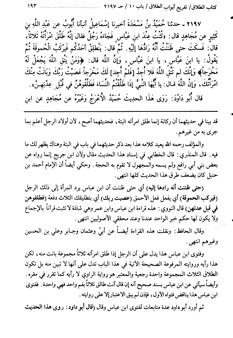 وفتوى بن عَبَّاسٍ هَذَا يَدُلُّ عَلَى أَنَّ الرَّجُلَ إِذَا طَلَّقَ امْرَأَتَهُ ثَلَاثًا مَجْمُوعَةً بَانَتْ مِنْهُ لَكِنْ هَذَا رَأْيُهُ وَرِوَايَتُهُ الْمَرْفُوعَةُ الصَّحِيحَةُ الْآتِيَةُ فِي هَذَا الْبَابِ تَدُلُّ عَلَى أَنَّهَا لَا تَبِينُ مِنْهُ بَلْ تَكُونُ الطَّلَاقُ الثَّلَاثُ الْمَجْمُوعَةُ وَاحِدَةً رَجْعِيَّةً وَالْمُعْتَبَرُ هُوَ رِوَايَةُ الرَّاوِي لَا رَأْيُهُ كَمَا تَقَرَّرَ فِي مَقَرِّهِ