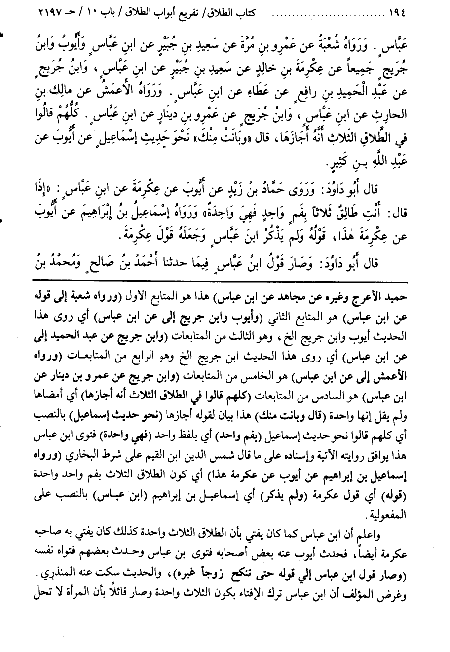 واعلم أن بن عَبَّاسٍ كَمَا كَانَ يُفْتِي بِأَنَّ الطَّلَاقَ الثَّلَاثَ وَاحِدَةٌ كَذَلِكَ كَانَ يُفْتِي بِهِ صَاحِبُهُ عِكْرِمَةُ أَيْضًا فَحَدَّثَ أَيُّوبُ عَنْهُ بَعْضَ أَصْحَابِهِ فَتْوَى بن عَبَّاسٍ وَحَدَّثَ بَعْضَهُمْ فَتْوَاهُ نَفْسُهُ (وَصَارَ قَوْلُ بن عَبَّاسٍ إِلَى قَوْلِهِ حَتَّى تَنْكِحَ زَوْجًا غَيْرَهُ) وَالْحَدِيثُ سَكَتَ عَنْهُ الْمُنْذِرِيُّ