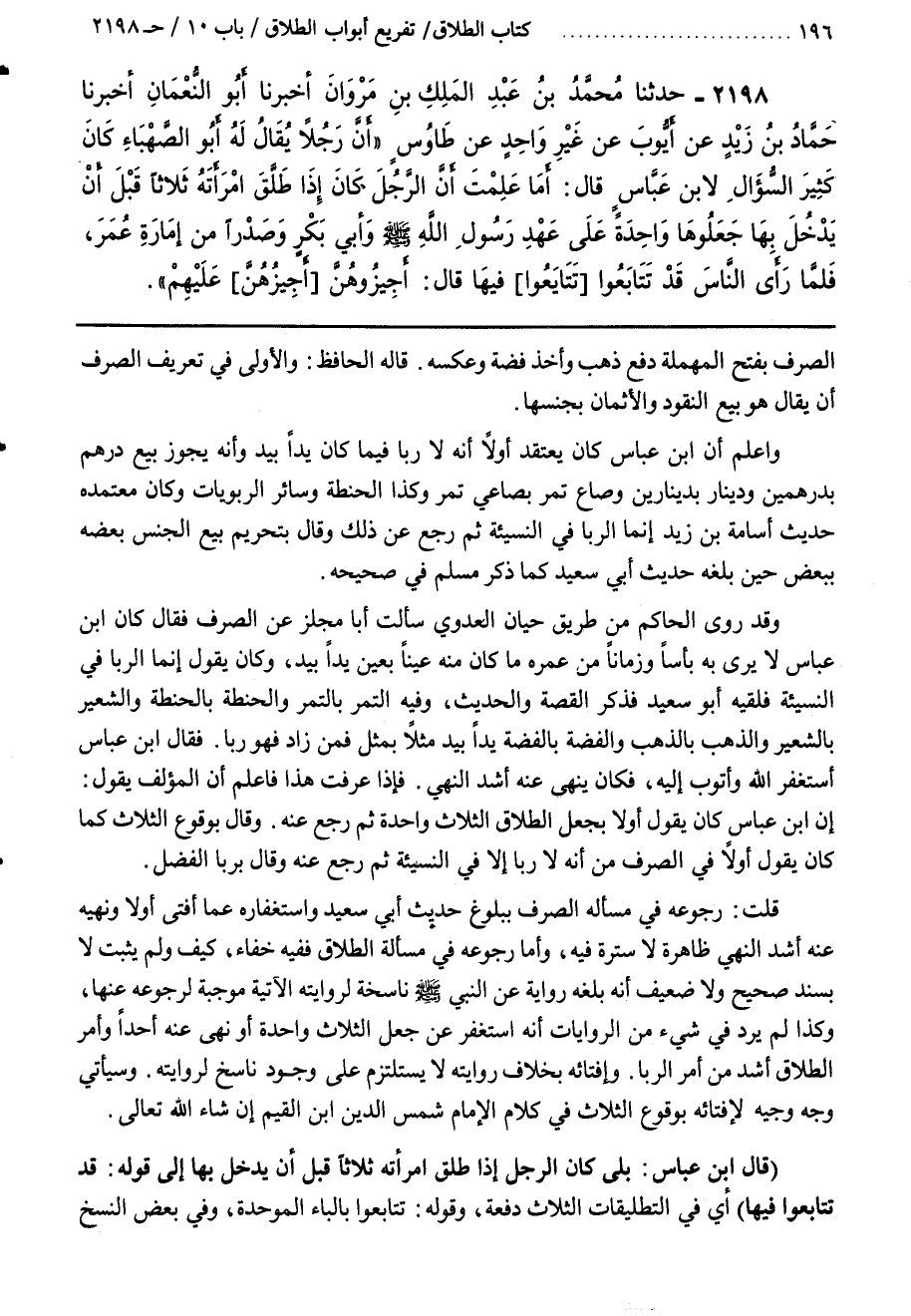 قُلْتُ رُجُوعُهُ فِي مَسْأَلَةِ الصَّرْفِ بِبَلُوغِ حَدِيثِ أَبِي سَعِيدٍ واستغفاره عما أفتى أولا ونهيه عند أَشَدَّ النَّهْيِ ظَاهِرةٌ لَا سُتْرَةَ فِيهِ وَأَمَّا رُجُوعُهُ فِي مَسْأَلَةِ الطَّلَاقِ فَفِيهِ خَفَاءٌ كَيْفَ وَلَمْ يَثْبُتْ لَا بِسَنَدٍ صَحِيحٍ وَلَا ضَعِيفٍ أَنَّهُ بَلَغَهُ رِوَايَةٌ عَنِ النَّبِيِّ صَلَّى اللَّهُ عَلَيْهِ وَسَلَّمَ نَاسِخَةٌ لِرِوَايَتِهِ الْآتِيَةِ مُوجِبَةٌ لِرُجُوعِهِ عَنْهَا وَكَذَا لَمْ يَرِدْ فِي شَيْءٍ مِنَ الرِّوَايَاتِ أَنَّهُ اسْتَغْفَرَ عَنْ جَعْلِ الثَّلَاثِ وَاحِدَةً أَوْ نَهَى عَنْهُ أَحَدًا وَأَمْرُ الطَّلَاقِ أَشَدُّ من أمر الربا