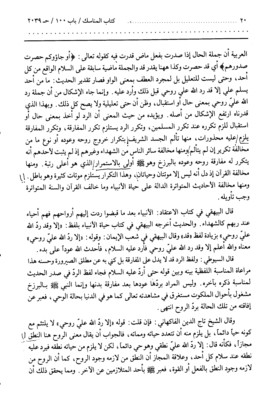 قَالَ الشَّيْخُ تَاجُ الدِّينِ الْفَاكِهَانِيُّ فَإِنْ قُلْتَ قَوْلُهُ إِلَّا رَدَّ اللَّهُ عَلَيَّ رُوحِي لَا يَلْتَئِمُ مَعَ كَوْنِهِ حَيًّا دَائِمًا بَلْ يَلْزَمُ مِنْهُ أَنْ تَتَعَدَّدَ حَيَاتُهُ وَمَمَاتُهُ فَالْجَوَابُ أَنْ يُقَالَ مَعْنَى الرُّوحِ هُنَا النُّطْقُ مَجَازًا فَكَأَنَّهُ قَالَ إِلَّا رَدَّ اللَّهُ عَلَيَّ نُطْقِي وَهُوَ حَيٌّ دَائِمًا لَكِنْ لَا يَلْزَمُ مِنْ حَيَاتِهِ نُطْقُهُ فَيُرَدُّ عَلَيْهِ نُطْقُهُ عِنْدَ سَلَامِ كُلِّ أَحَدٍ وَعِلَاقَةُ الْمَجَازِ أَنَّ النُّطْقَ مِنْ لَازِمِهِ وُجُودُ الرُّوحِ كَمَا أَنَّ الرُّوحَ مِنْ لَازِمِهِ وُجُودُ النُّطْقِ بَالْفِعْلِ أَوِ الْقُوَّةِ فَعَبَّرَ صَلَّى اللَّهُ عَلَيْهِ وَسَلَّمَ بِأَحَدِ الْمُتَلَازِمَيْنِ عَنِ الْآخَرِ