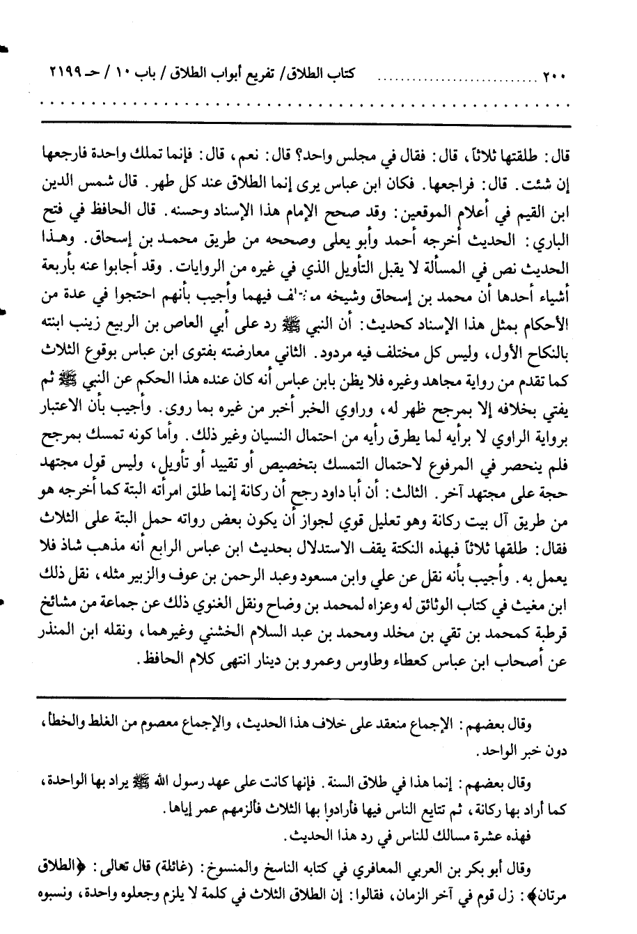 وَقَالَ أَبُو بَكْر بْن الْعَرَبِيّ الْمَعَافِرِيّ فِي كِتَابه النَّاسِخ وَالْمَنْسُوخ (غَائِلَة) قَالَ تَعَالَى (الطَّلَاق مَرَّتَانِ) زَلَّ قَوْم فِي آخِر الزَّمَان فَقَالُوا إِنَّ الطَّلَاق الثَّلَاث فِي كَلِمَةٍ لَا يَلْزَم وَجَعَلُوهُ وَاحِدَة وَنَسَبُوهُ