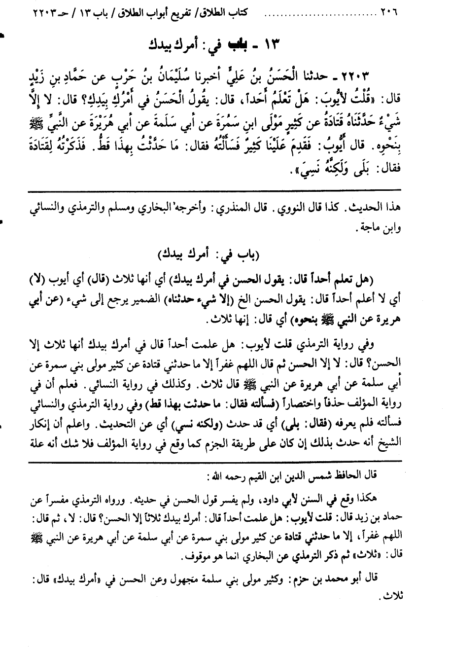 قَالَ أَبُو مُحَمَّد بْن حَزْم وَكَثِير مَوْلَى بَنِي سَلَمَة مَجْهُول وَعَنْ الْحَسَن فِي أَمْرك بِيَدِك قال ثلاث