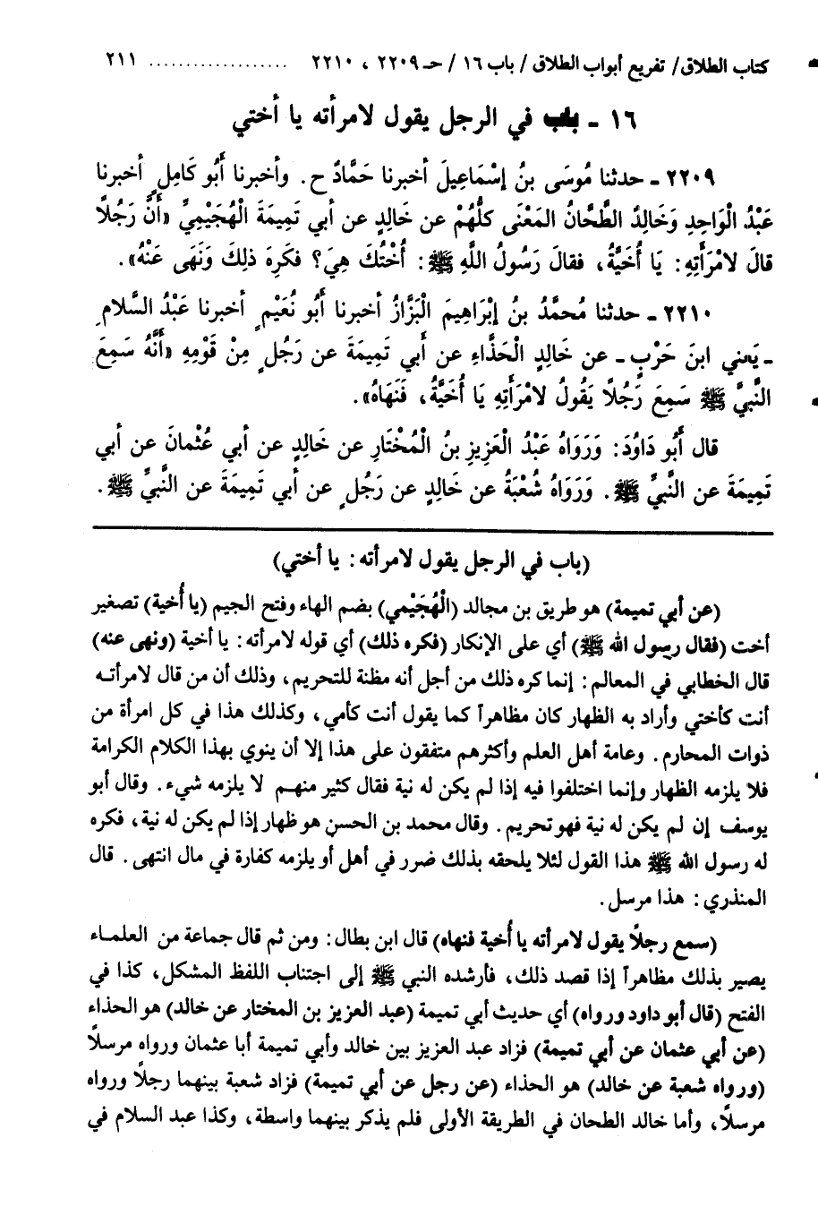(سَمِعَ رَجُلًا يَقُولُ لِامْرَأَتِهِ ياأخية فنهاه) قال بن بَطَّالٍ وَمِنْ ثَمَّ قَالَ جَمَاعَةٌ مِنَ الْعُلَمَاءِ يَصِيرُ بِذَلِكَ مُظَاهِرًا إِذَا قَصَدَ ذَلِكَ فَأَرْشَدَهُ النَّبِيُّ صَلَّى اللَّهُ عَلَيْهِ وَسَلَّمَ إِلَى اجْتِنَابِ اللَّفْظِ الْمُشْكِلِ كَذَا فِي الْفَتْحِ (قَالَ أَبُو دَاوُدَ وَرَوَاهُ) أَيْ حَدِيثَ أَبِي تَمِيمَةَ (عَبْدُ الْعَزِيزِ بْنُ الْمُخْتَارِ عَنْ خَالِدٍ) هُوَ الْحَذَّاءُ (عَنْ أَبِي عُثْمَانَ عَنْ أَبِي تَمِيمَةَ) فَزَادَ عَبْدُ الْعَزِيزِ بَيْنَ خَالِدٍ وَأَبِي تَمِيمَةَ أَبَا عُثْمَانَ وَرَوَاهُ مُرْسَلًا وَرَوَاهُ شُعْبَةُ عَنْ خَالِدٍ هُوَ الْحَذَّاءُ (عَنْ رَجُلٍ عَنْ أَبِي تَمِيمَةَ) فَزَادَ شُعْبَةُ بَيْنَهُمَا رَجُلًا وَرَوَاهُ مُرْسَلًا وَأَمَّا خَالِدٌ الطَّحَّانُ فِي الطَّرِيقَةِ الْأُولَى فَلَمْ يَذْكُرْ بَيْنَهُمَا وَاسِطَةٌ وَكَذَا عَبْدُ السَّلَامِ فِي