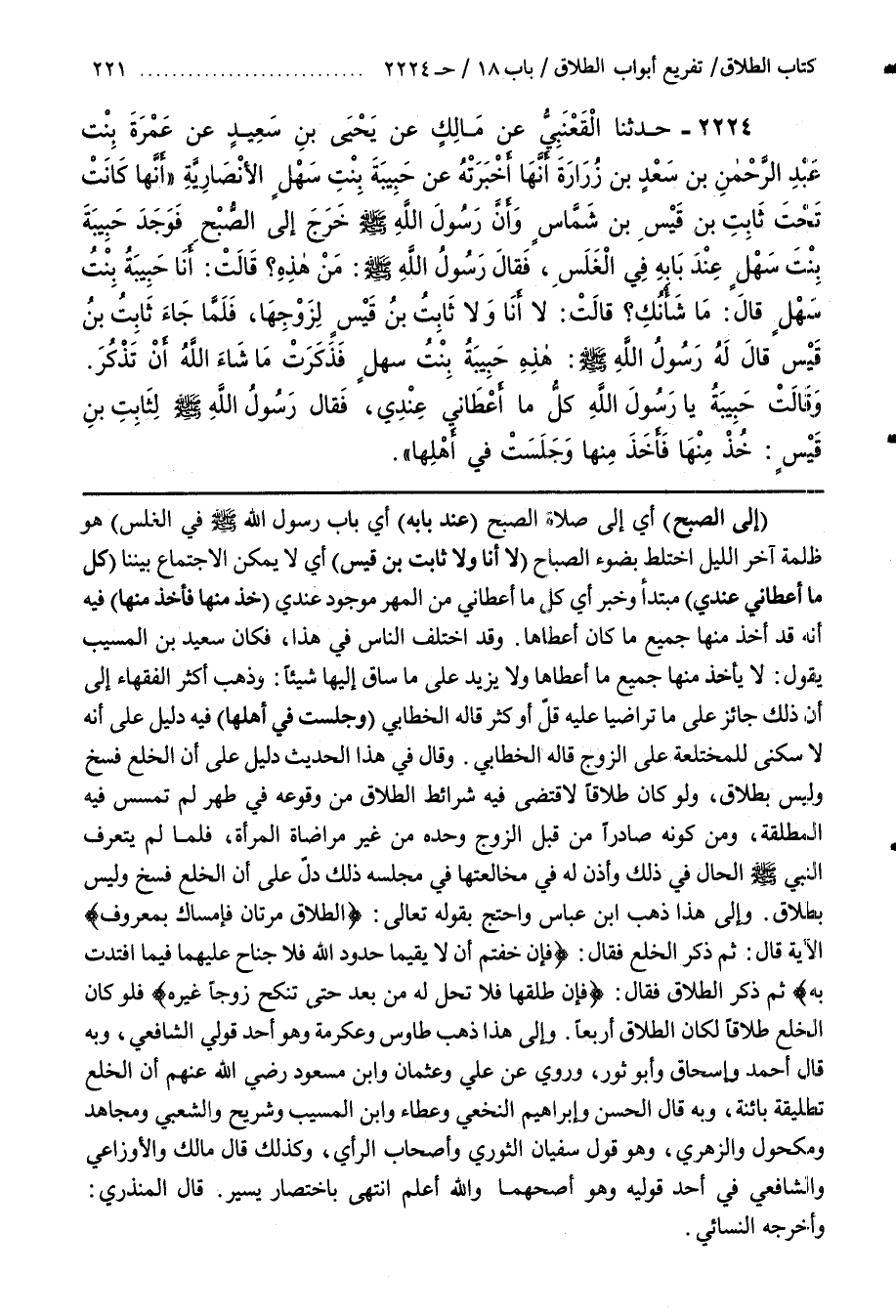 وَقَالَ فِي هَذَا الْحَدِيثِ دَلِيلٌ عَلَى أَنَّ الْخُلْعَ فَسْخٌ وَلَيْسَ بِطَلَاقٍ وَلَوْ كَانَ طَلَاقًا لَاقْتُضِيَ فِيهِ شَرَائِطُ الطَّلَاقِ مِنْ وُقُوعِهِ فِي طُهْرٍ لَمْ تُمْسَسْ فِيهِ الْمُطَلَّقَةُ وَمِنْ كَوْنِهِ صَادِرًا مِنْ قِبَلِ الزَّوْجِ وَحْدَهُ مِنْ غَيْرِ مُرَاضَاةِ الْمَرْأَةِ فَلَمَّا لَمْ يَتَعَرَّفِ النَّبِيُّ صَلَّى اللَّهُ عَلَيْهِ وَسَلَّمَ الْحَالَ فِي ذَلِكَ وَأَذِنَ لَهُ فِي مُخَالَعَتِهَا فِي مَجْلِسِهِ ذَلِكَ دَلَّ عَلَى أَنَّ الْخُلْعَ فسخ وليس بطلاق