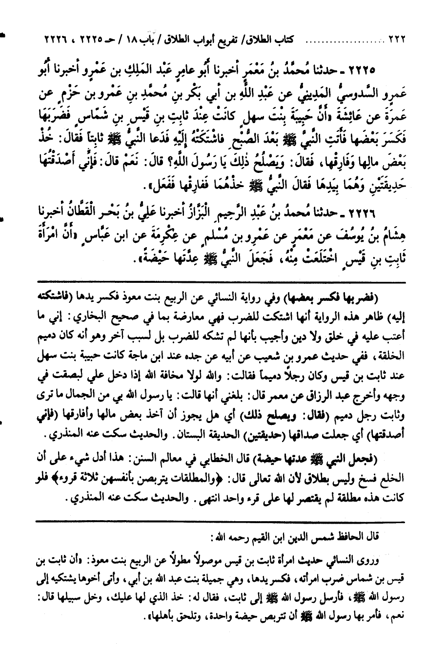 ــــــــــــQقال الحافظ شمس الدين بن القيم رحمه اللَّه وَرَوَى النَّسَائِيّ حَدِيث اِمْرَأَة ثَابِت بْن قَيْس مَوْصُولًا مُطَوَّلًا عَنْ الرُّبَيِّع بِنْت مُعَوِّذ أَنَّ ثَابِت بْن قَيْس بْن شَمَّاس ضَرَبَ اِمْرَأَته فَكَسَرَ يَدهَا وَهِيَ جَمِيلَة بِنْت عَبْد اللَّه بْن أُبَيّ وَأَتَى أَخُوهَا يَشْتَكِيه إِلَى رَسُول اللَّه صَلَّى اللَّه عَلَيْهِ وَسَلَّمَ فَأَرْسَلَ رَسُول اللَّه صَلَّى اللَّه عَلَيْهِ وَسَلَّمَ إِلَى ثَابِت فَقَالَ لَهُ خُذْ الَّذِي لَهَا عَلَيْك وَخَلّ سَبِيلهَا قَالَ نَعَمْ فَأَمَرَ بِهَا رَسُول اللَّه صَلَّى اللَّه عَلَيْهِ وَسَلَّمَ أَنْ تَتَرَبَّص حَيْضَة وَاحِدَة وَتَلْحَق بِأَهْلِهَا