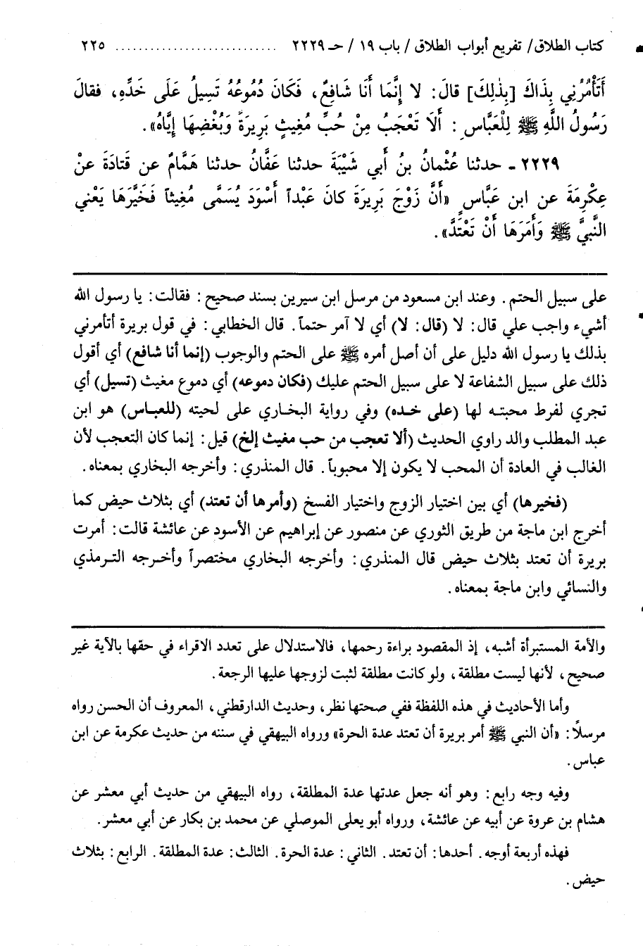 قَالَ الخطابي في قول بريرة أتأمرني بذلك يارسول اللَّهِ دَلِيلٌ عَلَى أَنَّ أَصْلَ أَمْرِهِ صَلَّى اللَّهُ عَلَيْهِ وَسَلَّمَ عَلَى الْحَتْمِ وَالْوُجُوبِ (إِنَّمَا أَنَا شَافِعٌ) أَيْ أَقُولُ ذَلِكَ عَلَى سَبِيلِ الشَّفَاعَةِ لَا عَلَى سَبِيلِ الْحَتْمِ عَلَيْكِ (فَكَانَ دُمُوعُهُ) أَيْ دُمُوعُ مُغِيثٍ (تَسِيلُ) أَيْ تَجْرِي لِفَرْطِ مَحَبَّتِهِ لَهَا (عَلَى خَدِّهِ) وَفِي رِوَايَةِ البخاري على لحيته (للعباس) هو بن عَبْدِ الْمُطَّلِبِ وَالِدُ رَاوِي الْحَدِيثِ (أَلَا تَعْجَبَ مِنْ حُبِّ مُغِيثٍ إِلَخْ) قِيلَ إِنَّمَا كَانَ التَّعَجُّبُ لِأَنَّ الْغَالِبَ فِي الْعَادَةِ أَنَّ الْمُحِبَّ لَا يَكُونُ إِلَّا مَحْبُوبًا
