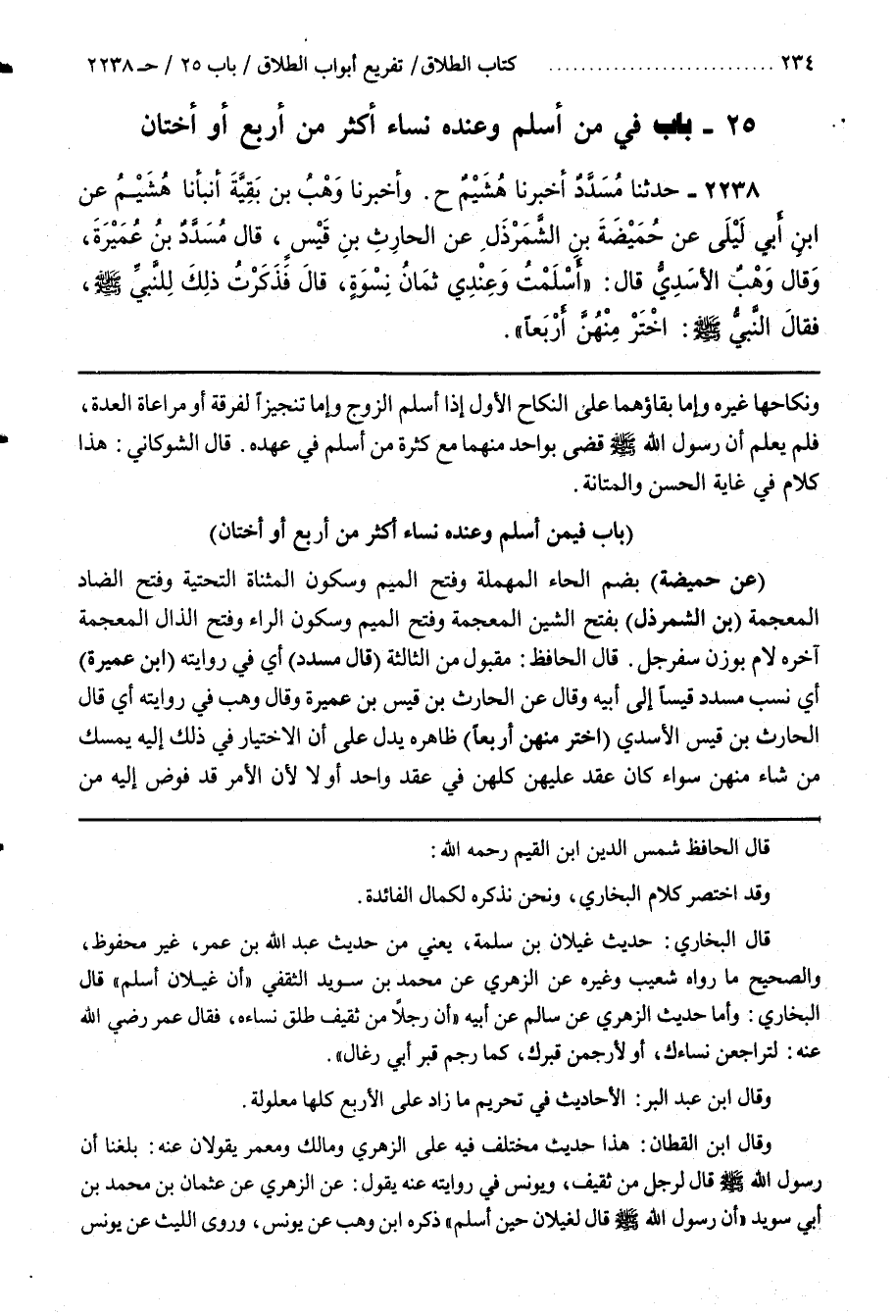 قَالَ الْحَافِظُ مَقْبُولٌ مِنَ الثَّالِثَةِ (قَالَ مُسَدَّدُ) أَيْ فِي روايته (بن عُمَيْرَةَ) أَنَّ نَسَبَ مُسَدَّدٌ قَيْسًا إِلَى أَبِيهِ وَقَالَ عَنِ الْحَارِثِ بْنِ قَيْسِ بْنِ عُمَيْرَةَ وَقَالَ وَهْبٌ فِي رِوَايَتِهِ أَيْ قَالَ الْحَارِثُ بْنُ قَيْسٍ الْأَسَدِيُّ (اخْتَرْ مِنْهُنَّ أَرْبَعًا) ظَاهِرُهُ يَدُلُّ عَلَى أَنَّ الِاخْتِيَارَ فِي ذَلِكَ إِلَيْهِ يُمْسِكُ مَنْ شَاءَ مِنْهُنَّ سَوَاءً كَانَ عَقَدَ عَلَيْهِنَّ كُلَّهُنَّ فِي عَقْدٍ وَاحِدٍ أَوْ لَا لِأَنَّ الْأَمْرَ قَدْ فُوِّضَ إِلَيْهِ مِنَ