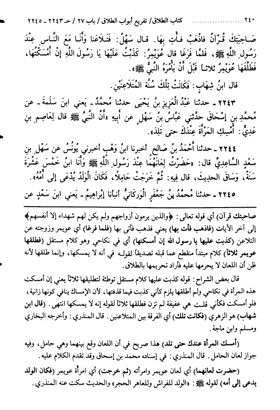 صَاحِبَتِكَ قُرْآنٌ) أَيْ قَوْلُهُ تَعَالَى وَالَّذِينَ يَرْمُونَ أَزْوَاجَهُمْ وَلَمْ يَكُنْ لَهُمْ شُهَدَاءُ إِلَّا أَنْفُسُهُمْ إِلَى آخِرِ الْآيَاتِ (فَاذْهَبْ فَأْتِ بِهَا) يَعْنِي فَذَهَبَ فَأَتَى بِهَا (فَلَمَّا فَرَغَا) أَيْ عُوَيْمِرٌ وزوجته عن التلاعن (كذبت عليها يارسول اللَّهِ إِنْ أَمْسَكْتُهَا) أَيْ فِي نِكَاحِي وَهُوَ كَلَامٌ مُسْتَقِلٌّ (فَطَلَّقَهَا عُوَيْمِرٌ ثَلَاثًا) كَلَامٌ مُبْتَدَأٌ مُنْقَطِعٌ عَمَّا قَبْلَهُ تَصْدِيقًا لِقَوْلِهِ فِي أَنَّهُ لَا يُمْسِكُهَا وَإِنَّمَا طَلَّقَهَا لِأَنَّهُ ظَنَّ أَنَّ اللِّعَانَ لَا يُحَرِّمُهَا عَلَيْهِ فَأَرَادَ تَحْرِيمَهَا بَالطَّلَاقِ
