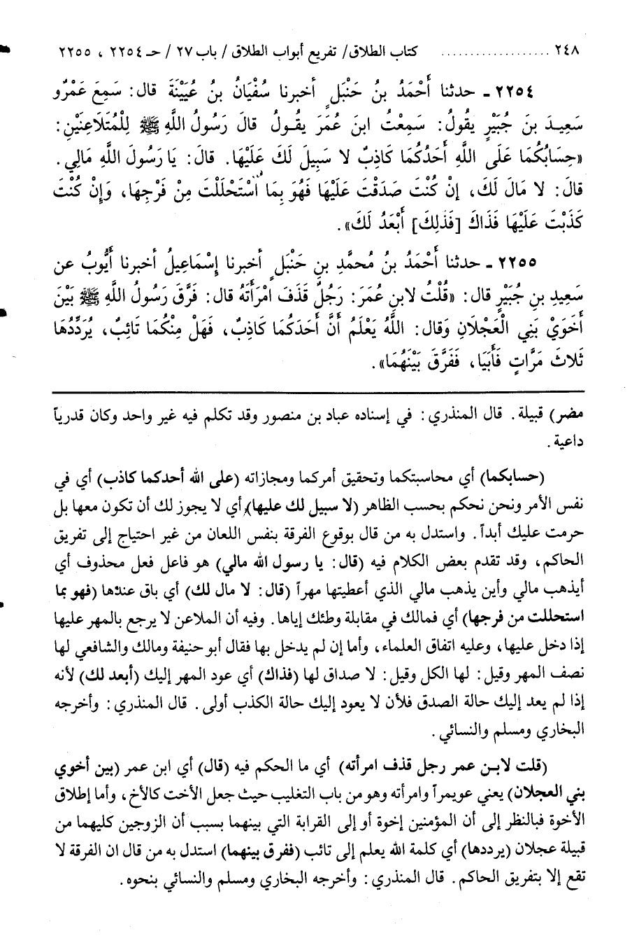 (قُلْتُ لِابْنِ عُمَرَ رَجُلٌ قَذَفَ امْرَأَتَهُ) أَيْ مَا الْحُكْمُ فِيهِ (قَالَ) أَيِ بن عُمَرَ (بَيْنَ أَخَوَيْ بَنِي الْعَجْلَانِ) يَعْنِي عُوَيْمِرًا وَامْرَأَتَهُ وَهُوَ مِنْ بَابِ التَّغْلِيبِ حَيْثُ جَعَلَ الْأُخْتَ كَالْأَخِ وَأَمَّا إِطْلَاقُ الْأُخُوَّةِ فَبَالنَّظَرِ إِلَى أَنَّ الْمُؤْمِنِينَ إِخْوَةٌ أَوْ إِلَى الْقَرَابَةِ الَّتِي بَيْنَهُمَا بِسَبَبِ أَنَّ الزَّوْجَيْنِ كِلَيْهِمَا مِنْ قَبِيلَةِ عَجْلَانَ (يُرَدِّدُهَا) أَيْ كَلِمَةُ اللَّهُ يَعْلَمُ إِلَى تَائِبٍ (فَفَرَّقَ بَيْنَهُمَا) اسْتَدَلَّ بِهِ مَنْ قَالَ إِنَّ الْفُرْقَةَ لَا تَقَعُ إِلَّا بِتَفْرِيقِ الْحَاكِمِ