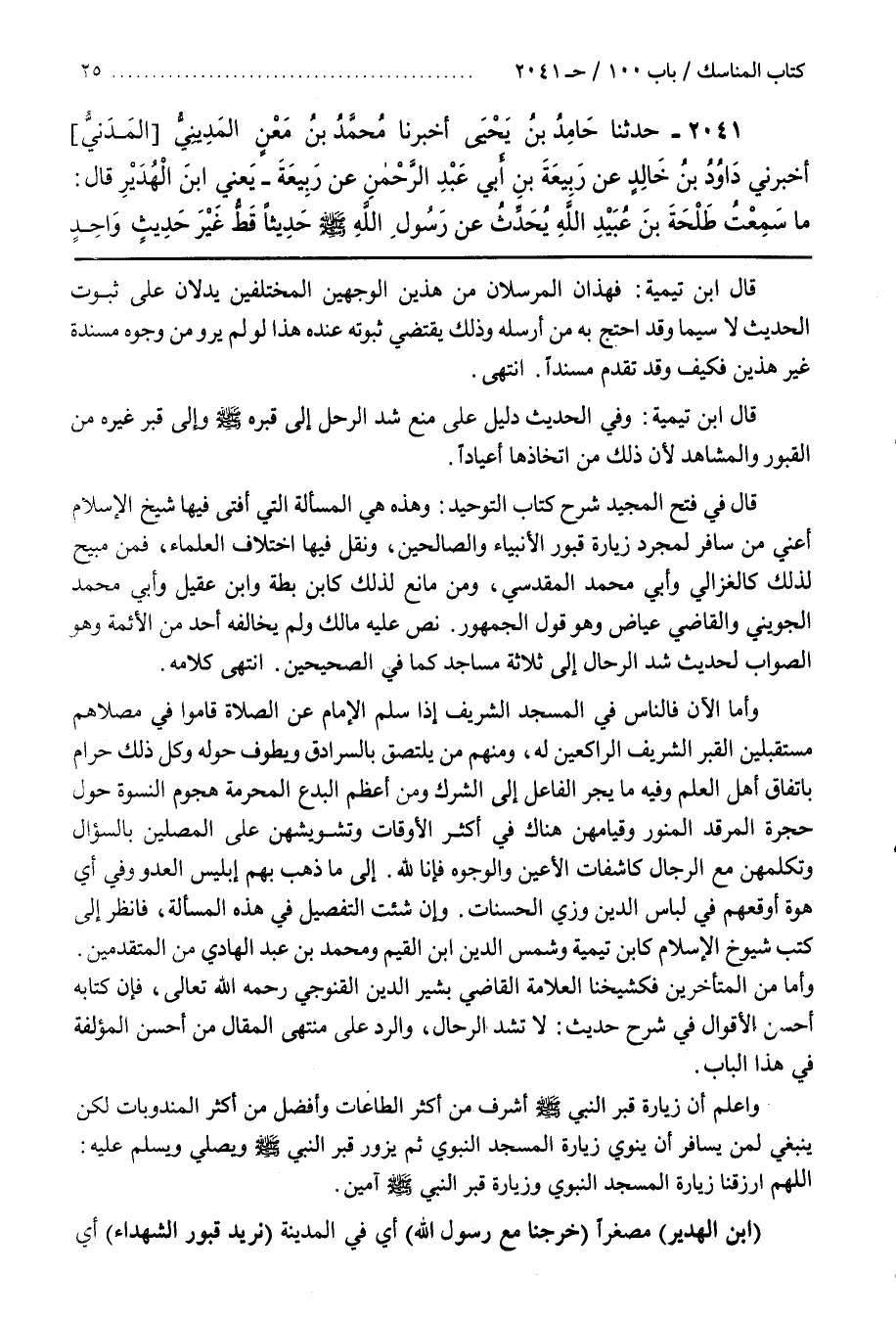 قال بن تَيْمِيَةَ وَفِي الْحَدِيثِ دَلِيلٌ عَلَى مَنْعِ شَدِّ الرَّحْلِ إِلَى قَبْرِهِ صَلَّى اللَّهُ عَلَيْهِ وَسَلَّمَ وَإِلَى قَبْرِ غَيْرِهِ مِنَ الْقُبُورِ وَالْمَشَاهِدِ لِأَنَّ ذَلِكَ مِنَ اتِّخَاذِهَا أَعْيَادًا