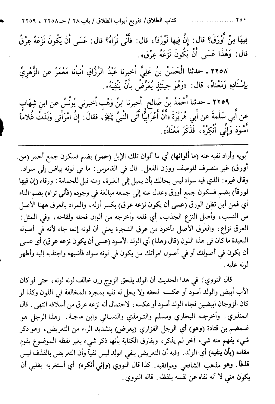 قَالَ النَّوَوِيُّ فِي هَذَا الْحَدِيثِ أَنَّ الْوَلَدَ يَلْحَقُ الزَّوْجَ وَإِنْ خَالَفَ لَوْنُهُ لَوْنَهُ حَتَّى لَوْ كَانَ الْأَبُ أَبْيَضَ وَالْوَلَدُ أَسْوَدَ أَوْ عَكْسُهُ لَحِقَهُ وَلَا يَحِلُّ لَهُ نَفْيُهُ بِمُجَرَّدِ الْمُخَالَفَةِ فِي اللَّوْنِ وَكَذَا لَوْ كَانَ الزَّوْجَانِ أَبْيَضَيْنِ فَجَاءَ الْوَلَدُ أَسْوَدَ أَوْ عَكْسُهُ لِاحْتِمَالِ أَنَّهُ نَزَعَهُ عِرْقٌ مِنْ أَسْلَافِهِ انْتَهَى
