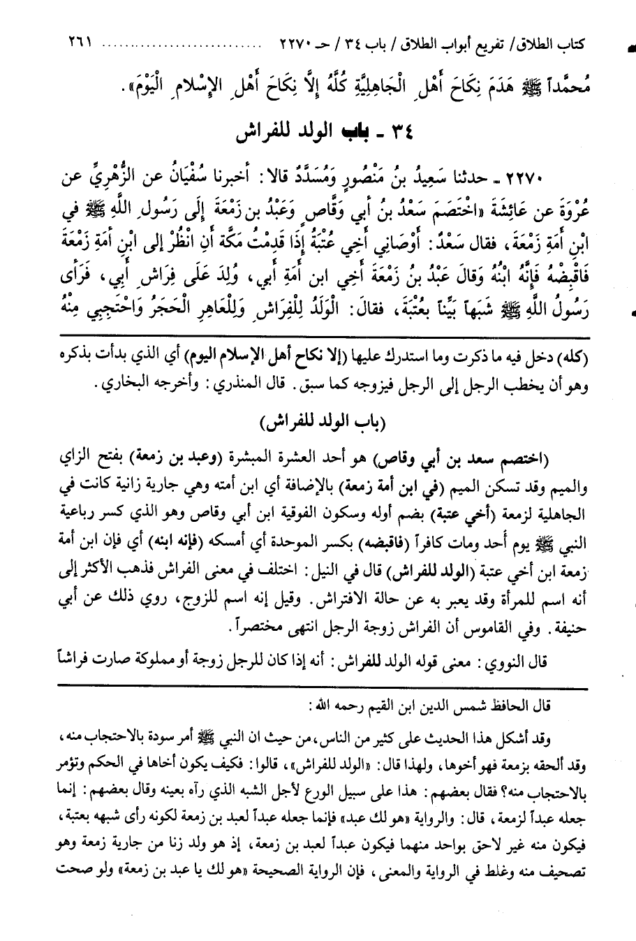 ــــــــــــQقال الحافظ شمس الدين بن القيم رحمه اللَّه وَقَدْ أَشْكَلَ هَذَا الْحَدِيث عَلَى كَثِير مِنْ النَّاس مِنْ حَيْثُ إِنَّ النَّبِيّ صَلَّى اللَّه عَلَيْهِ وَسَلَّمَ أَمَرَ سَوْدَة بِالِاحْتِجَابِ مِنْهُ وَقَدْ أَلْحَقهُ بِزَمْعَة فَهُوَ أَخُوهَا وَلِهَذَا قَالَ الْوَلَد لِلْفِرَاشِ قَالُوا فَكَيْف يَكُون أَخَاهَا فِي الْحُكْم وَتُؤْمَر بِالِاحْتِجَابِ مِنْهُ فَقَالَ بَعْضهمْ هَذَا عَلَى سَبِيل الْوَرَع لِأَجْلِ الشَّبَه الَّذِي رَآهُ بِعَيْنِهِ وَقَالَ بَعْضهمْ إِنَّمَا جَعَلَهُ عَبْدًا لِزَمْعَة قَالَ وَالرِّوَايَة هُوَ لَك عَبْد فَإِنَّمَا جَعَلَهُ عَبْدًا لِعَبْدِ بْن زَمْعَة لِكَوْنِهِ رَأَى شَبَهه بعتبة فيكون منه غير لاحق بواحد منهما فيكون عبدا لعبد بن زَمْعَة إِذْ هُوَ وَلَد زِنَا مِنْ جَارِيَة زَمْعَة وَهَذَا تَصْحِيف مِنْهُ وَغَلَط فِي الرِّوَايَة وَالْمَعْنَى فَإِنَّ الرِّوَايَة الصَّحِيحَة هُوَ لَك يَا عبد بن زمعة ولو صحت