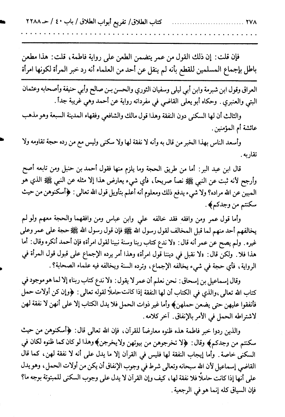 قال بن عَبْد الْبَرّ أَمَّا مِنْ طَرِيق الْحُجَّة وَمَا يَلْزَم مِنْهَا فَقَوْل أَحْمَد بْن حَنْبَل وَمَنْ تَابَعَهُ أَصِحّ وَأَرْجَح لِأَنَّهُ ثَبَتَ عَنْ النَّبِيّ صَلَّى اللَّه عَلَيْهِ وَسَلَّمَ نَصًّا صَرِيحًا فَأَيّ شَيْء يُعَارِض هَذَا إِلَّا مِثْله عَنْ النَّبِيّ صلى الله عليه وسلم الَّذِي هُوَ الْمُبَيِّن عَنْ اللَّه مُرَاده وَلَا شَيْء يَدْفَع ذَلِكَ وَمَعْلُوم أَنَّهُ أَعْلَم بِتَأْوِيلِ قَوْل اللَّه تَعَالَى {أُسْكِنُوهُنَّ مِنْ حَيْثُ سَكَنْتُمْ مِنْ وُجْدِكُمْ}