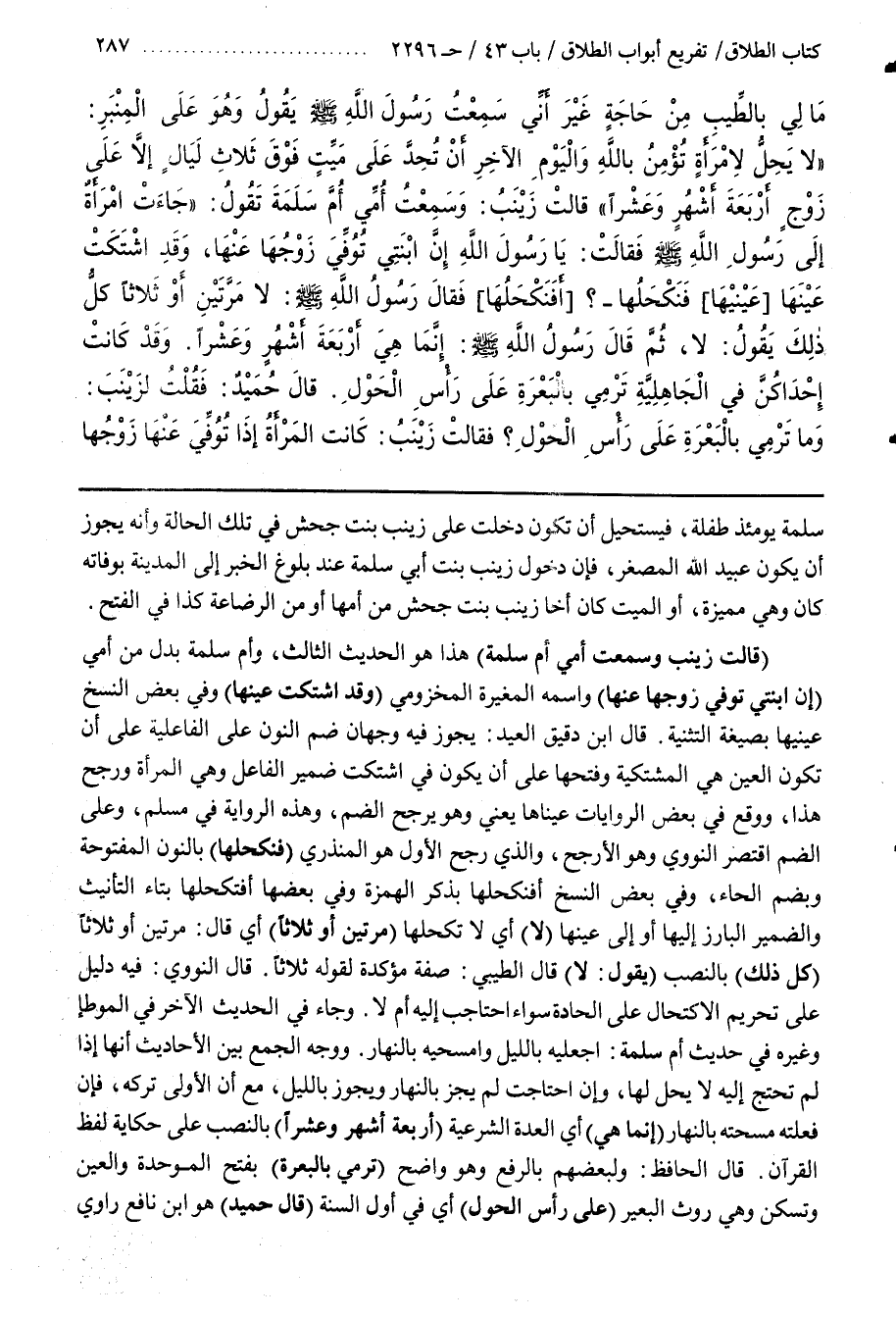 قَالَ النَّوَوِيُّ فِيهِ دَلِيلٌ عَلَى تَحْرِيمِ الِاكْتِحَالِ عَلَى الْحَادَّةِ سَوَاءٌ احْتَاجَتْ إِلَيْهِ أَمْ لَا