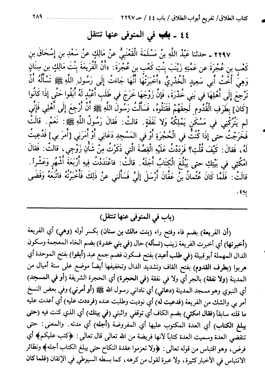 (أَنَّ الْفُرَيْعَةَ) بِضَمِّ فَاءٍ وَفَتْحِ رَاءٍ (بِنْتَ مَالِكِ بْنِ سِنَانٍ) بِكَسْرِ أَوَّلِهِ (وَهِيَ) أَيِ الْفُرَيْعَةُ (أَخْبَرَتْهَا) أَيْ أَخْبَرَتِ الْفُرَيْعَةُ زَيْنَبَ (تَسْأَلُهُ) حَالٌ (فِي بَنِي خُدْرَةَ) بِضَمِّ الْخَاءِ الْمُعْجَمَةِ وَسُكُونِ الدَّالِ الْمُهْمَلَةِ أَبُو قَبِيلَةٍ (فِي طَلَبِ أَعْبُدٍ) بِفَتْحٍ فَسُكُونٍ فَضَمٍّ جَمْعُ عَبْدٍ (أَبَقُوا) بِفَتْحِ الْمُوَحَّدَةِ أَيْ هَرَبُوا (بِطَرَفِ الْقَدُّومِ) بِفَتْحِ الْقَافِ وَتَشْدِيدِ الدَّالِ وَتَخْفِيفِهَا أَيْضًا مَوْضِعٌ عَلَى سِتَّةِ أَمْيَالٍ مِنَ الْمَدِينَةِ (وَلَا نَفَقَةٍ) بَالْجَرِّ أَيْ وَلَا فِي نَفَقَةٍ (فِي الْحُجْرَةِ) أَيِ الْحُجْرَةِ الشَّرِيفَةِ (أَوْ فِي الْمَسْجِدِ) أَيِ النَّبَوِيِّ وَهُوَ مَسْجِدُ الْمَدِينَةِ (دَعَانِي) أَيْ دَعَانِي رَسُولِ اللَّهِ صَلَّى اللَّهُ عَلَيْهِ وَسَلَّمَ (أَوْ أَمَرَنِي) وَفِي بَعْضِ النُّسَخِ أَمَرَ بِي وَالشَّكُّ مِنْ الْفُرَيْعَةِ (فَدُعِيتُ لَهُ) أَيْ نُودِيتُ وَطُلِبْتُ عِنْدَهُ (فَرَدَدْتُ عَلَيْهِ) أَيْ أَعَدْتُ عَلَيْهِ مَا قُلْتُهُ سَابِقًا (فَقَالَ امْكُثِي بِضَمِّ الْكَافِ أَيْ تَوَقَّفِي وَاثْبُتِي (فِي بَيْتِكِ) أَيِ الَّذِي كُنْتِ فِيهِ (حَتَّى يَبْلُغَ الْكِتَابُ) أَيِ الْعِدَّةُ الْمَكْتُوبُ عَلَيْهَا أَيِ الْمَفْرُوضَةُ (أَجَلَهُ) أَيْ مُدَّتَهُ