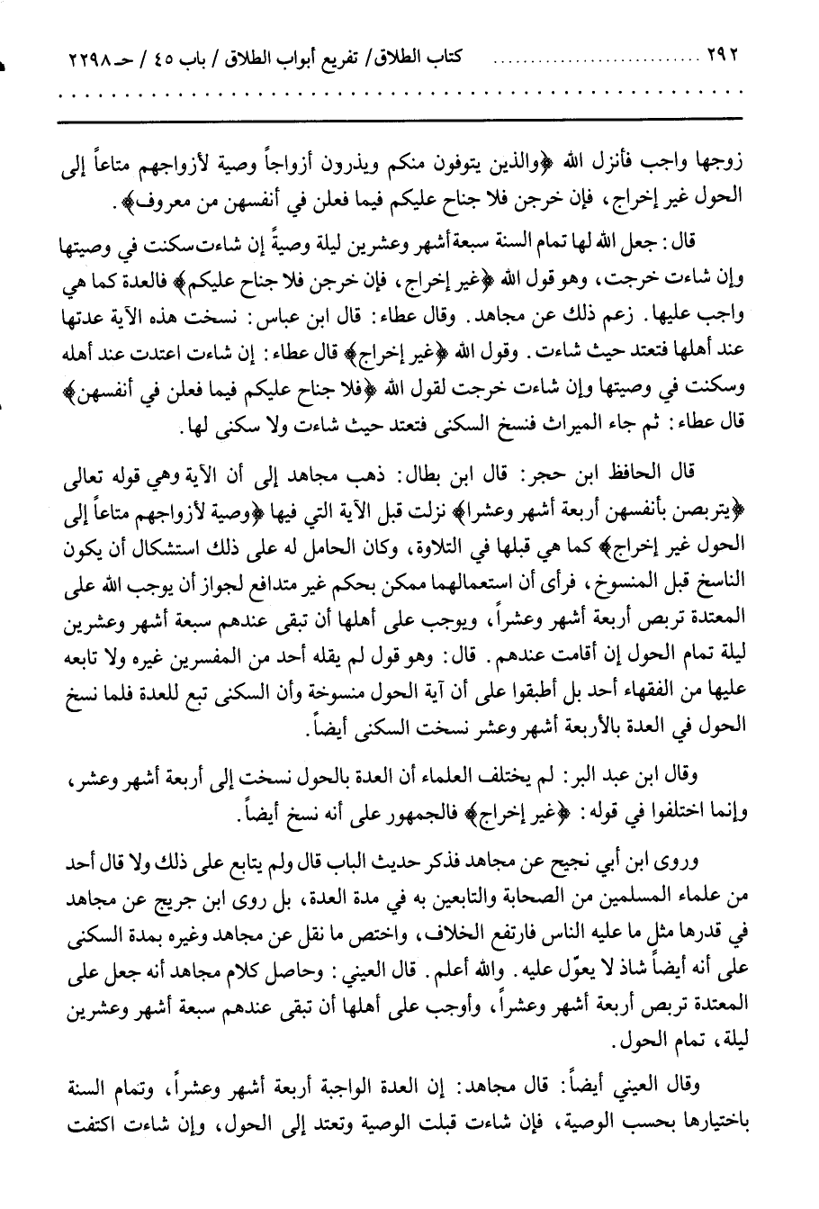 قَالَ وَهُوَ قَوْلٌ لَمْ يَقُلْهُ أَحَدٌ مِنَ الْمُفَسِّرِينَ غَيْرَهُ وَلَا تَابَعَهُ عَلَيْهَا مِنَ الْفُقَهَاءِ أَحَدٌ بَلْ أَطْبَقُوا عَلَى أَنَّ آيَةَ الْحَوْلِ مَنْسُوخَةٌ وَأَنَّ السُّكْنَى تَبَعٌ لِلْعِدَّةِ فَلَمَّا نُسِخَ الْحَوْلُ فِي الْعِدَّةِ بَالْأَرْبَعَةِ أَشْهُرٍ وَعَشْرٍ نُسِخَتِ السُّكْنَى أيضا