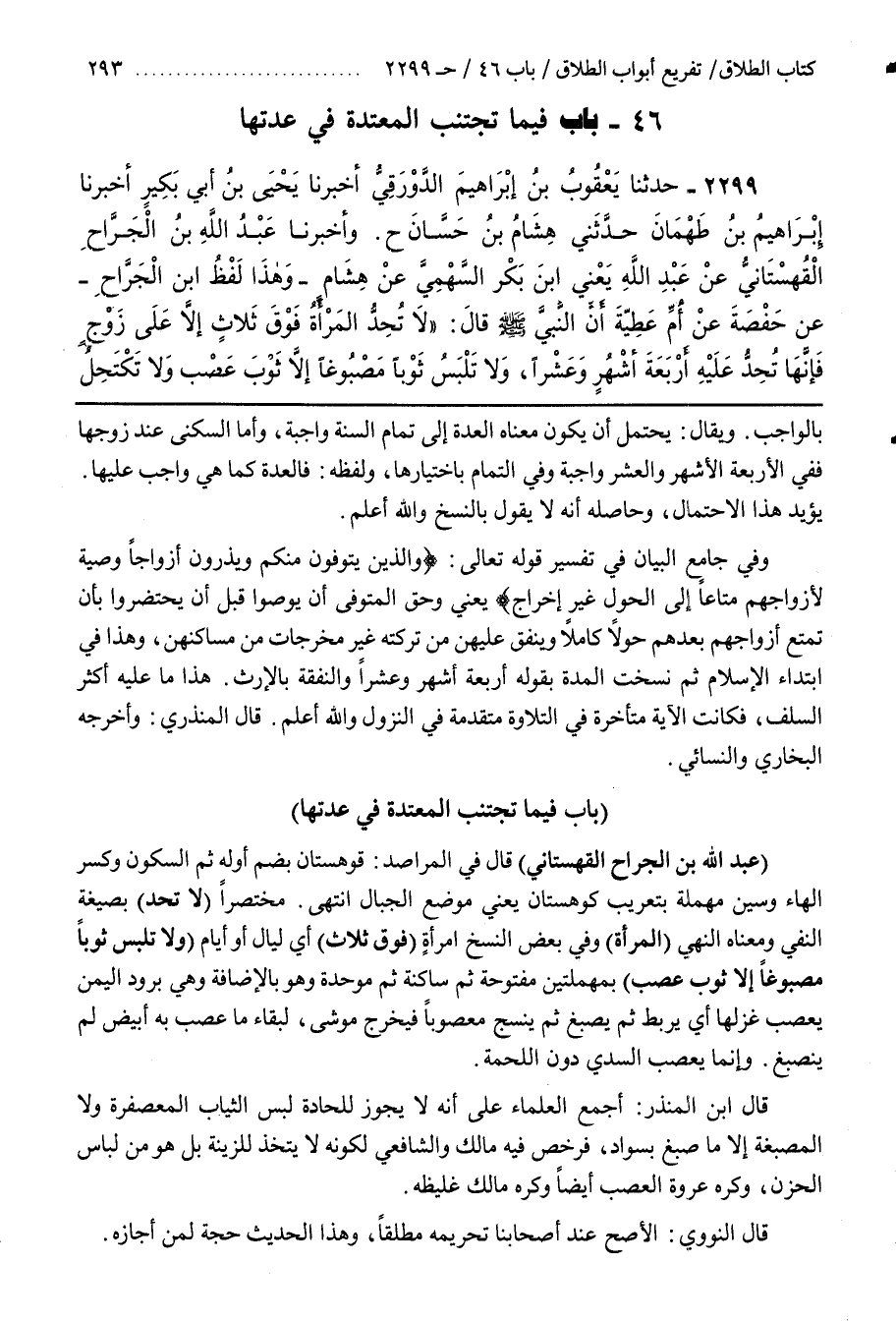 (عَبْدُ اللَّهِ بْنُ الْجَرَّاحِ الْقُهِسْتَانِيُّ) قَالَ فِي الْمَرَاصِدِ قُوهِسْتَانُ بِضَمِّ أَوَّلِهِ ثُمَّ السُّكُونِ وَكَسْرِ الْهَاءِ وَسِينٍ مُهْمَلَةٍ بِتَعْرِيبِ كُوهِسْتَانَ يَعْنِي مَوْضِعُ الْجِبَالِ انْتَهَى مُخْتَصَرًا (لَا تُحِدُّ) بِصِيغَةِ النَّفْيِ وَمَعْنَاهُ النَّهْيُ (الْمَرْأَةُ) وَفِي بَعْضِ النُّسَخِ امْرَأَةٌ (فَوْقَ ثَلَاثٍ) أَيْ لَيَالٍ أَوْ أَيَّامٍ (وَلَا تَلْبَسُ ثَوْبًا مَصْبُوغًا إِلَّا ثَوْبَ عَصْبٍ) بِمُهْمَلَتَيْنِ مَفْتُوحَةٍ ثُمَّ سَاكِنَةٍ ثُمَّ مُوَحَّدَةٍ وَهُوَ بَالْإِضَافَةِ وَهِيَ بُرُودُ الْيَمَنِ يُعْصَبُ غزلها أي يربط ثم يصبغ ثم ينسخ مَعْصُوبًا فَيَخْرُجُ مُوَشًّى لِبَقَاءِ مَا عُصِبَ بِهِ أَبْيَضَ لَمْ يَنْصَبِغْ