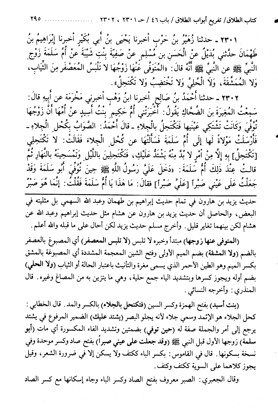 قَالَ الْخَطَّابِيُّ كُحْلُ الْجِلَاءِ هُوَ الْإِثْمِدُ وَسُمِّيَ جِلَاءً لِأَنَّهُ يَجْلُو الْبَصَرَ (يَشْتَدُّ عَلَيْكِ) الضَّمِيرُ الْمَرْفُوعُ فِي يَشْتَدُّ يَرْجِعُ إِلَى أَمْرٍ وَالْجُمْلَةُ صِفَةٌ لَهُ (حِينَ تُوُفِّيَ) بِضَمَّتَيْنِ وَتَشْدِيدِ الْفَاءِ الْمَكْسُورَةِ أَيْ مَاتَ (أَبُو سَلَمَةَ) زَوْجُهَا الْأَوَّلُ قَبْلَ النَّبِيِّ صَلَّى اللَّهُ عَلَيْهِ وَسَلَّمَ (وَقَدْ جَعَلْتُ عَلَى عَيْنِي صَبِرًا) بِفَتْحِ صَادٍ وَكَسْرِ مُوَحَّدَةٍ وَفِي نُسْخَةٍ بِسُكُونِهَا